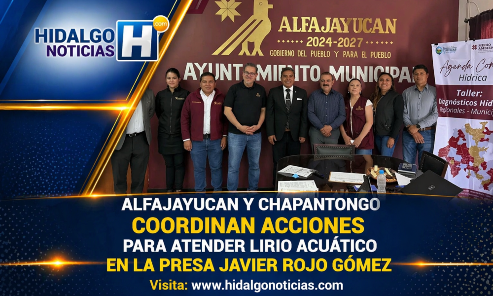 Los gobiernos municipales de Alfajayucan y Chapantongo sostuvieron una reunión de trabajo para abordar la problemática del lirio acuático en la presa Javier Rojo Gómez, con...