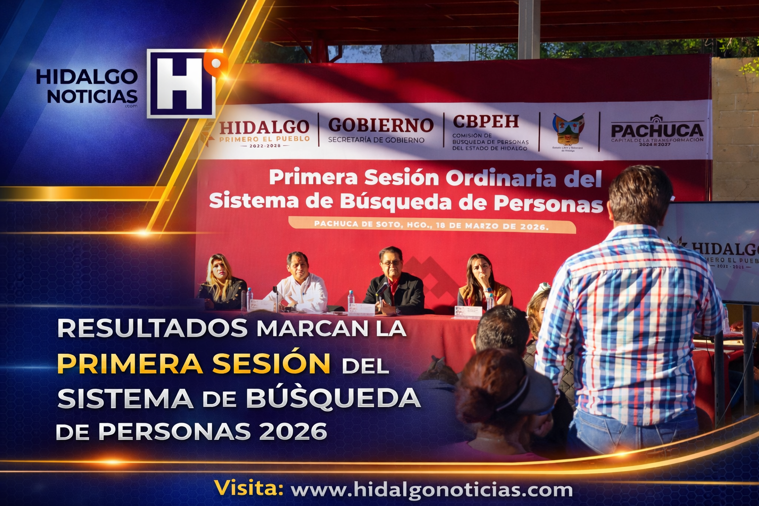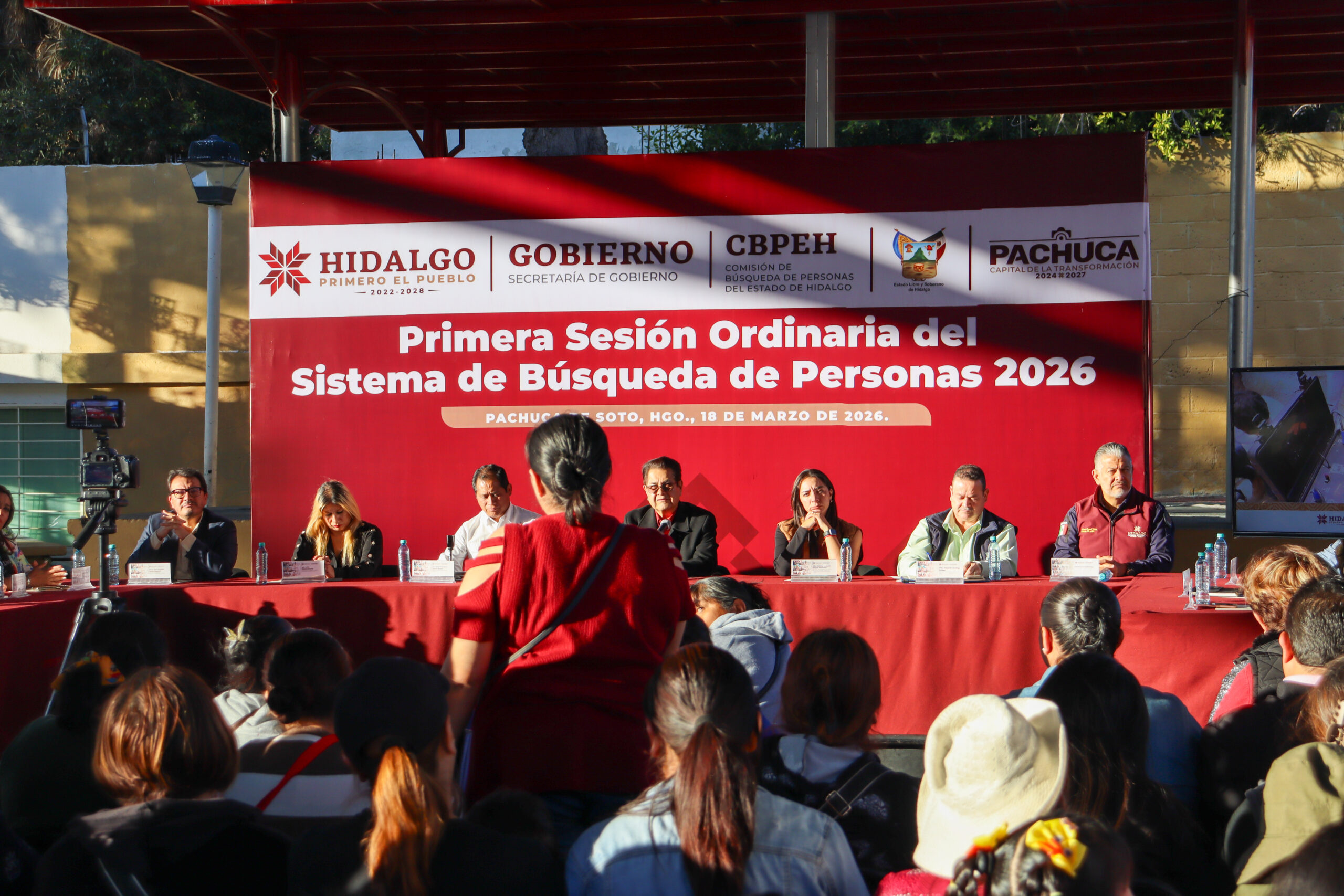 Pachuca, Hidalgo, 16 de marzo de 2026.— El secretario de Gobierno, Guillermo Olivares Reyna, encabezó la Primera Sesión Ordinaria del Sistema de Búsqueda de Personas 2026, donde se presentaron los resultados de la Comisión de Búsqueda de Personas del Estado de Hidalgo durante el primer trimestre del año.