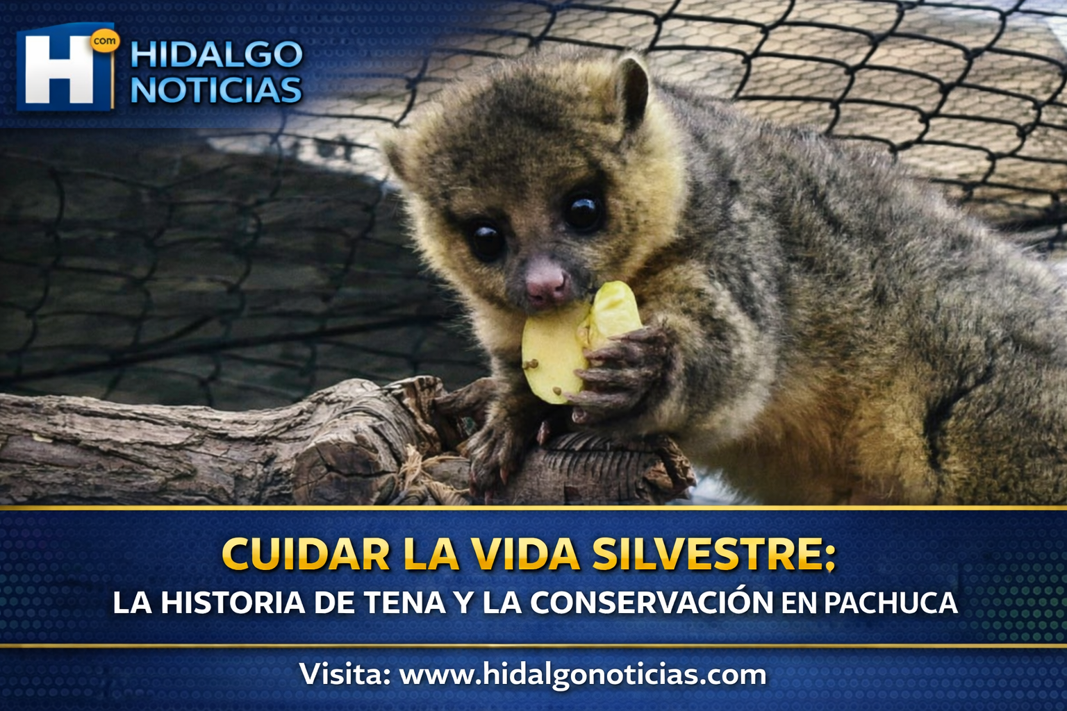 La cría, localizada con apenas unos días de nacida, fue trasladada a la Unidad de Rehabilitación de Fauna Silvestre de Pachuca, donde comenzó un programa integral de cuidados médicos, nutrición controlada y seguimiento conductual. El ejemplar fue nombrado Tena y pertenece a la especie conocida también como kinkajú, un mamífero nocturno y arborícola que habita principalmente en zonas de selva y bosque tropical. Está emparentado con los cacomixtles y mapaches y se caracteriza por su cola prensil, que le permite desplazarse y sujetarse con facilidad entre los árboles.