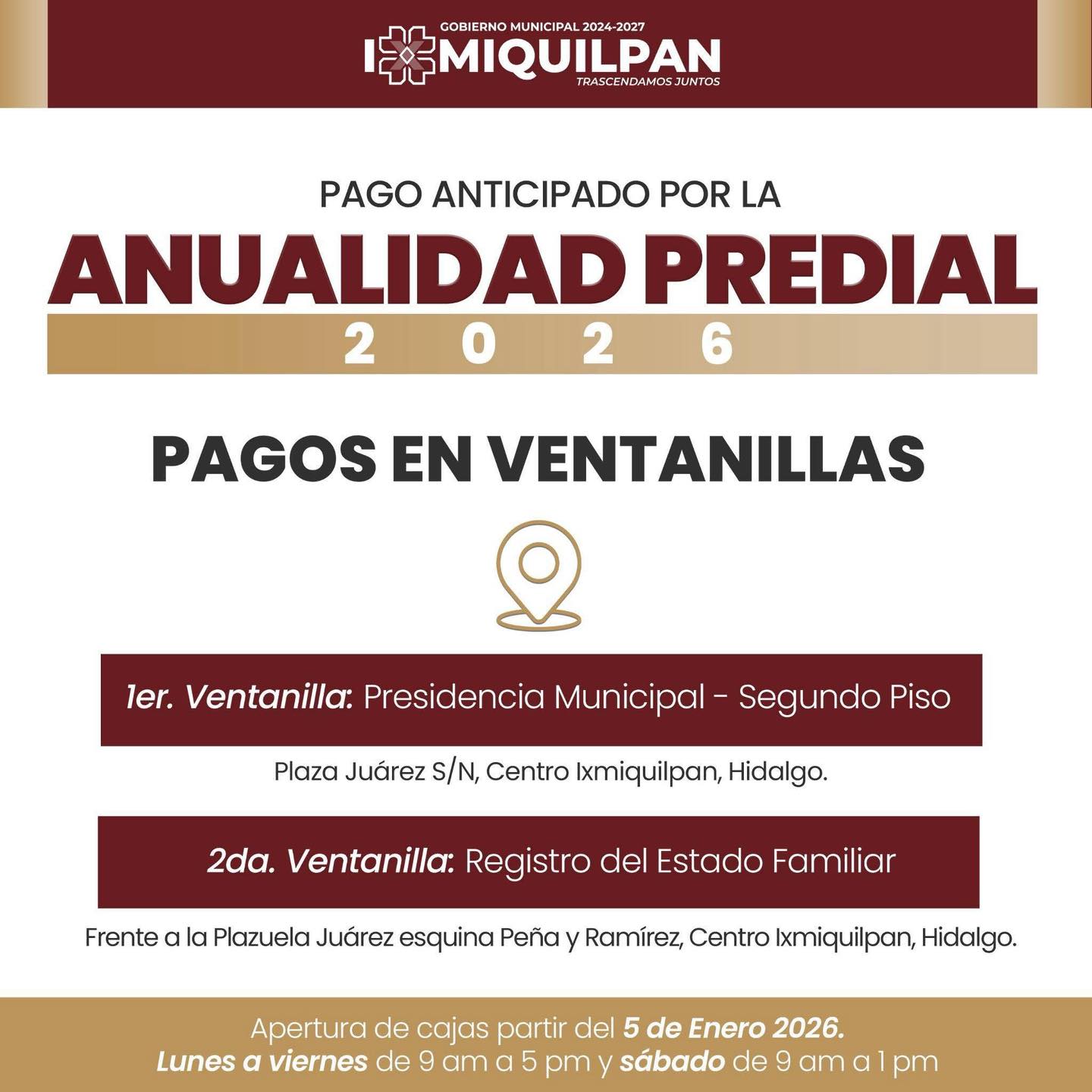Enero de 2026, Ixmiquilpan, Hidalgo. El Gobierno Municipal informó el arranque del periodo de recaudación del impuesto predial correspondiente al ejercicio 2026, el cual inició este lunes 5 de enero, con un esquema de incentivos que busca facilitar el cumplimiento oportuno de las obligaciones fiscales y fortalecer las finanzas públicas del municipio.