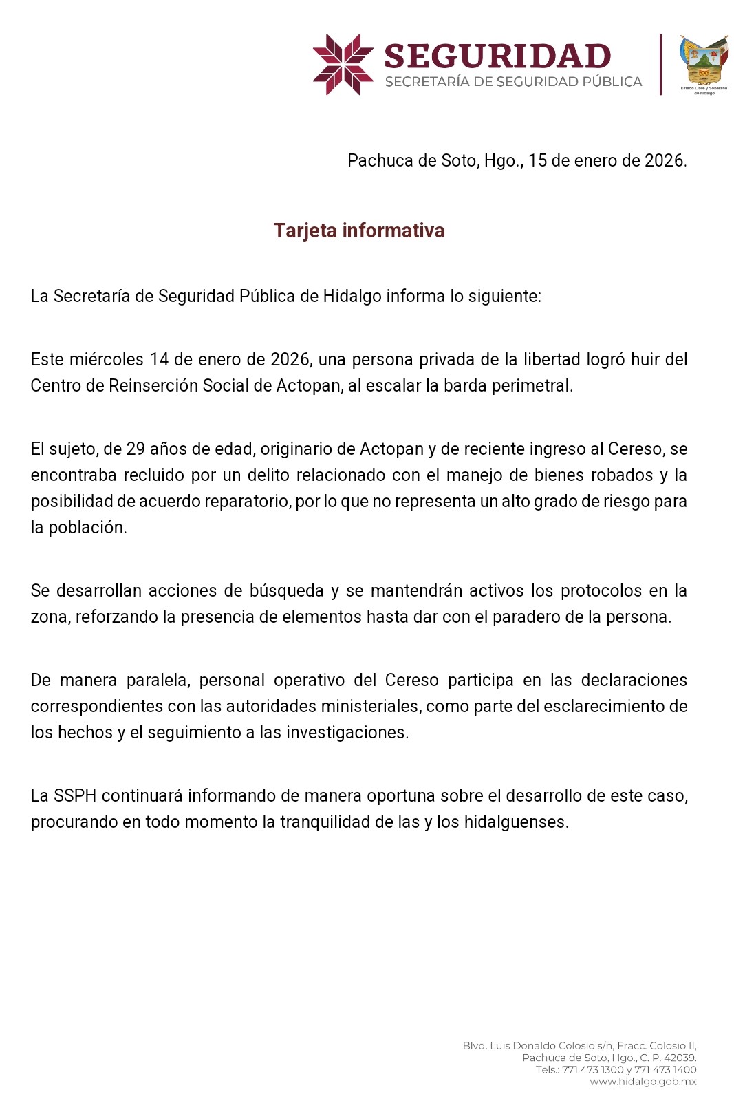 14 de enero de 2026, Actopan, Hidalgo. Una persona privada de la libertad logró evadirse del Centro de Reinserción Social de Actopan, luego de superar la barda perimetral del inmueble, hecho que activó de manera inmediata los protocolos de búsqueda y seguridad en la zona.