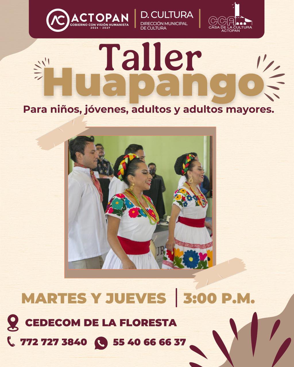 Actopan, Hidalgo.— El Ayuntamiento de Actopan, encabezado por la presidenta municipal Imelda Cuéllar Cano, invitó a la ciudadanía a integrarse al Taller de Huapango, una actividad promovida a través de la Dirección de Cultura con el propósito de abrir espacios de aprendizaje y expresión para la población.