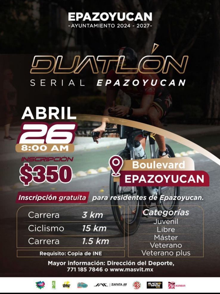 Epazoyucan, Hidalgo.— El municipio anunció la realización del Duatlón Serial Epazoyucan, un evento deportivo que reunirá a participantes interesados en poner a prueba su resistencia física a través de distintas disciplinas.