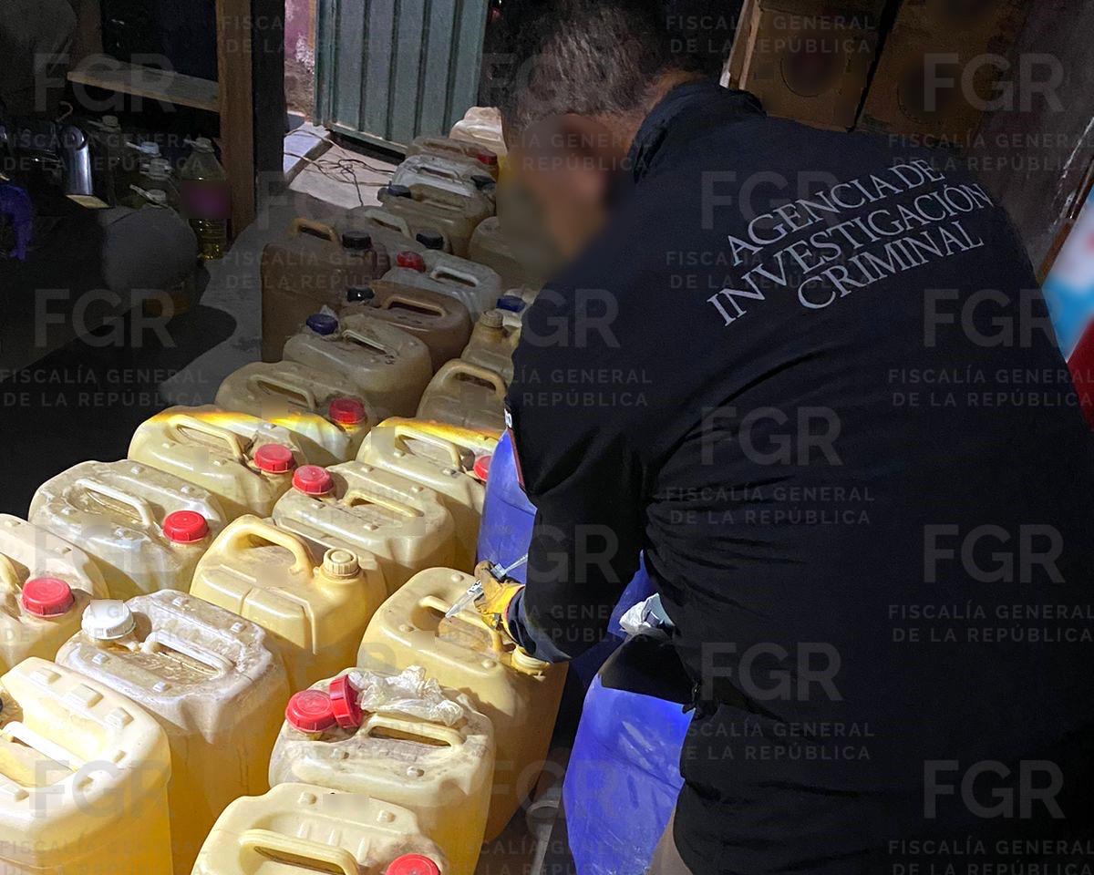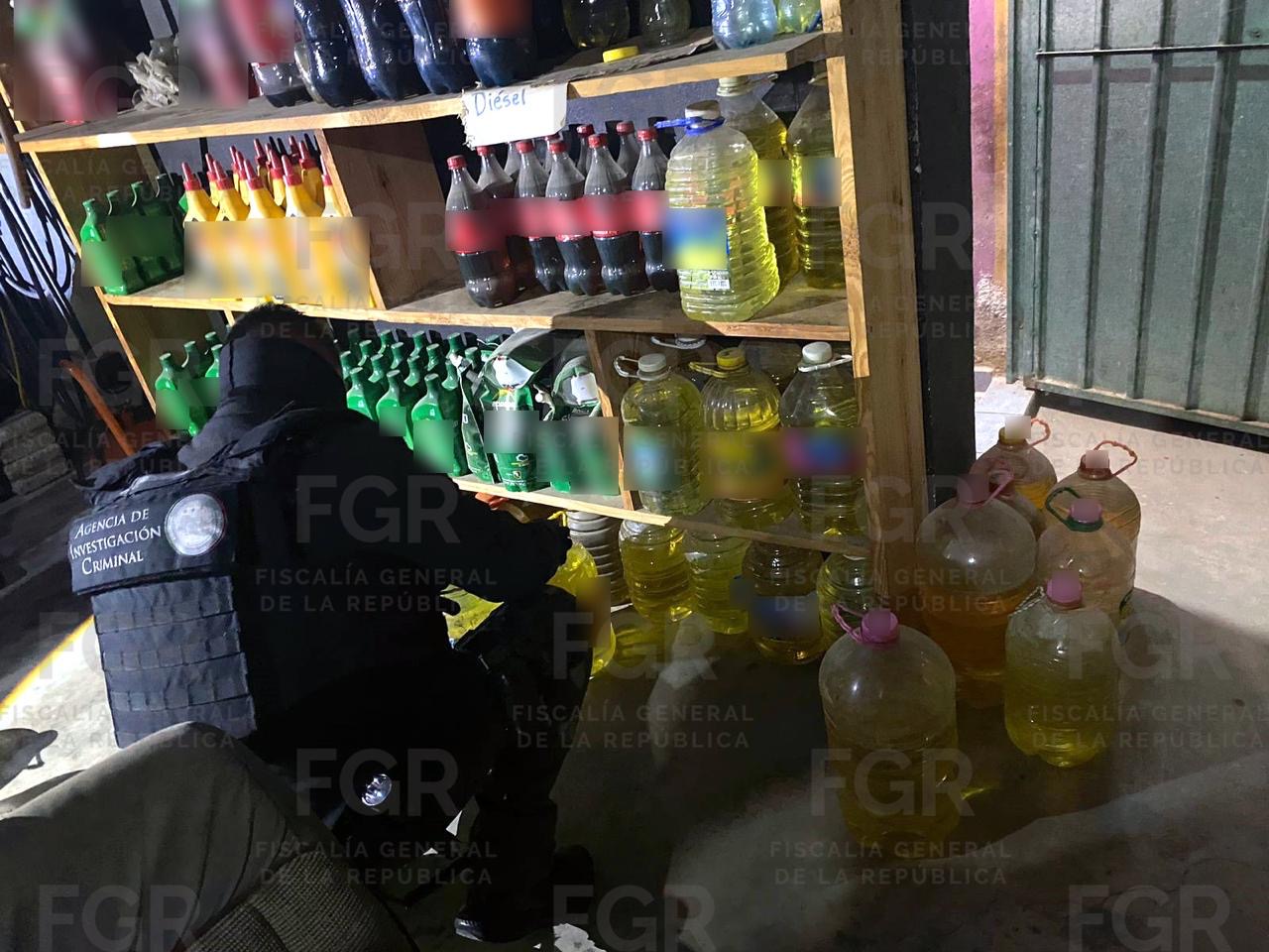 Durante la diligencia, se aseguraron alrededor de 2 mil 100 litros de hidrocarburo, así como más de un centenar de recipientes utilizados para su almacenamiento, entre ellos garrafones y envases de distintas capacidades.