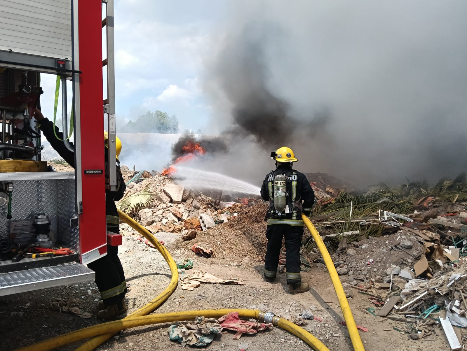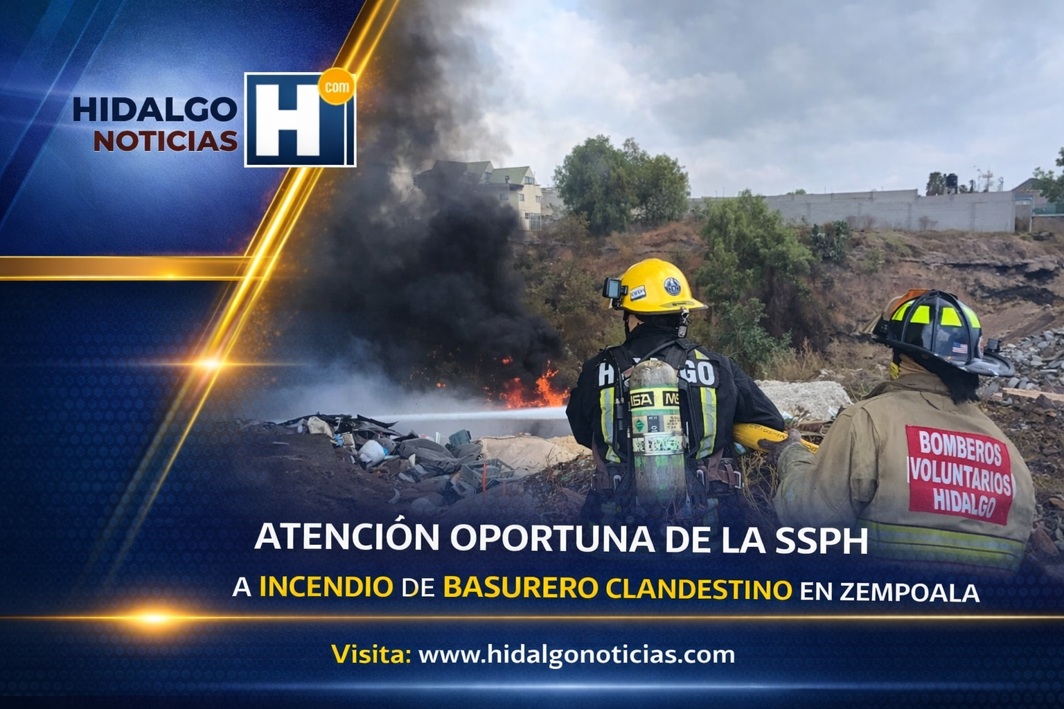 Elementos de la Secretaría de Seguridad Pública de Hidalgo (SSPH), mediante el H. Cuerpo de Bomberos, atienden un incendio registrado en la colonia El Mirador, en el municipio de Zempoala, donde un predio utilizado como tiradero clandestino de basura comenzó a arder debido a la acumulación de residuos.