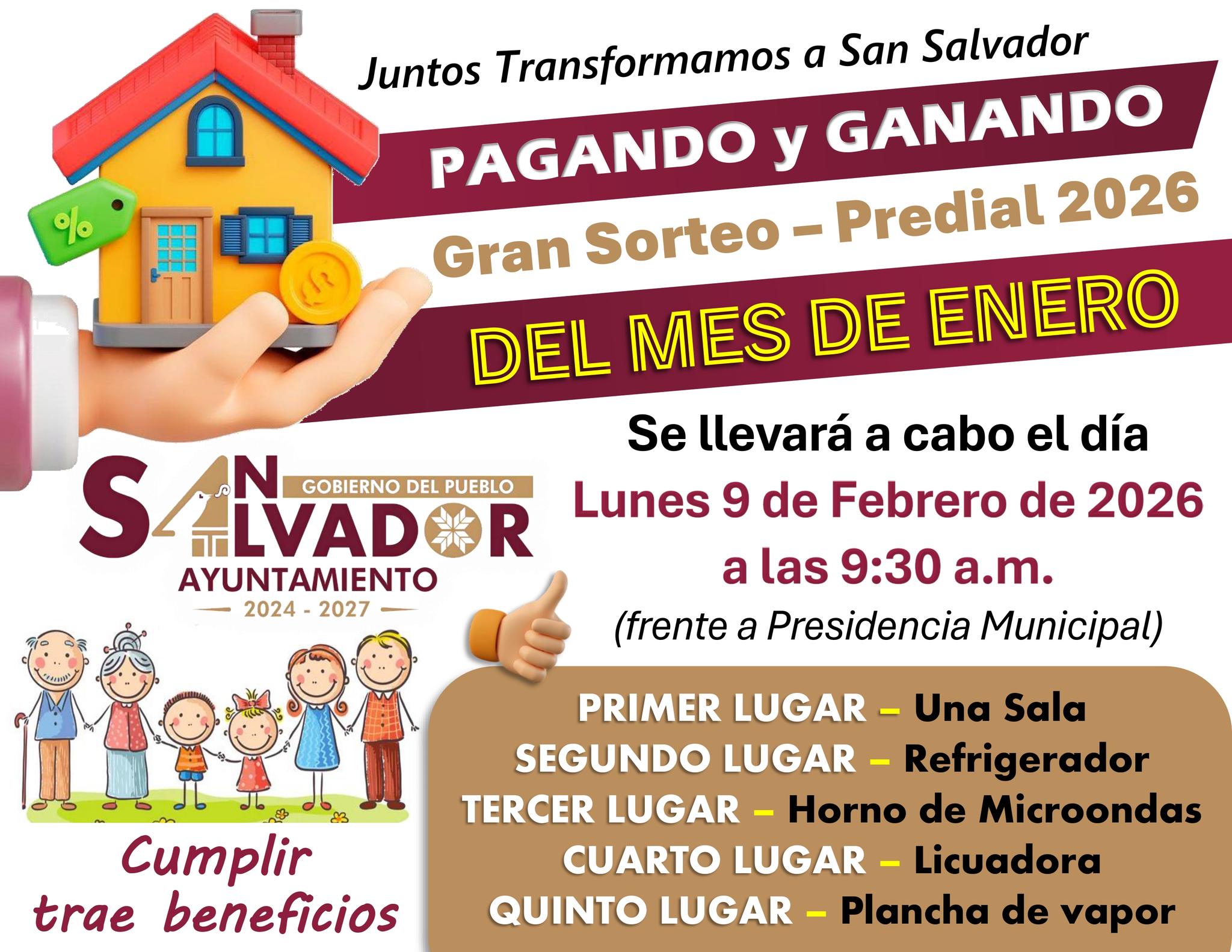 Febrero de 2026, San Salvador, Hidalgo.– El Ayuntamiento de San Salvador 2024–2027 realizará el sorteo correspondiente al mes de enero como una forma de reconocer el compromiso ciudadano de las y los contribuyentes que cumplieron de manera puntual con el pago de su impuesto predial, acción que fortalece las finanzas municipales y permite impulsar obras y servicios para la comunidad.