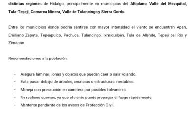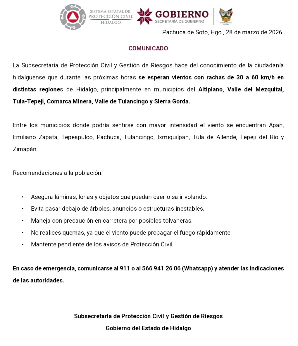 28 de marzo de 2026, Pachuca, Hidalgo.– Autoridades estatales informaron que durante las próximas horas se prevén rachas de viento de entre 30 y 60 kilómetros por hora en distintas regiones de Hidalgo, lo que podría generar riesgos para la población.