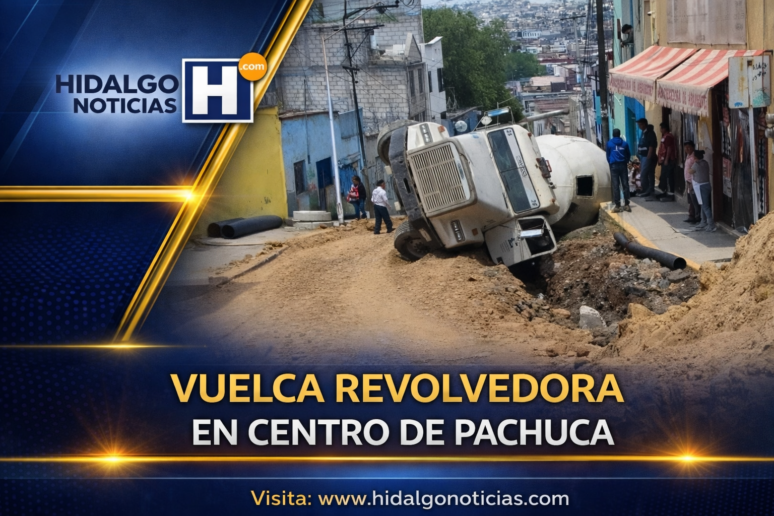 Una revolvedora volcó en una zona de obras en el centro de Pachuca, generando movilización y afectaciones a la circulación.