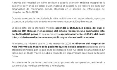 De acuerdo con la institución, la paciente de 7 años ingresó el 15 de febrero de 2026 al Hospital del Niño DIF Hidalgo con diagnóstico de meningitis, donde fue atendida por personal especializado del área de Infectología, recibiendo atención integral, oportuna y continua durante su estancia.