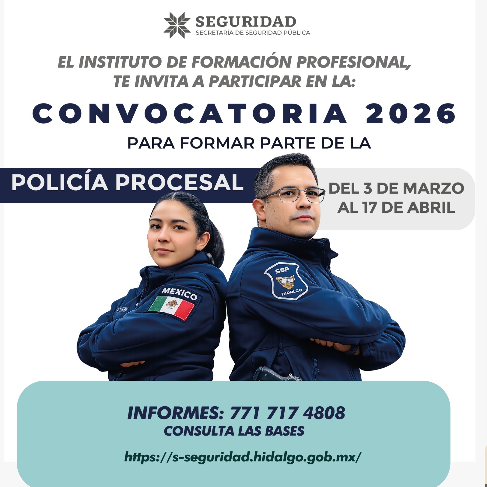 3 de marzo de 2026, Hidalgo.— La Secretaría de Seguridad Pública de Hidalgo, a través de su Instituto de Formación Profesional, lanzó la convocatoria correspondiente al proceso de reclutamiento 2026 para la incorporación de nuevos elementos como Policías Procesales, con el objetivo de reforzar las labores de seguridad en las salas de audiencia del sistema de justicia penal.