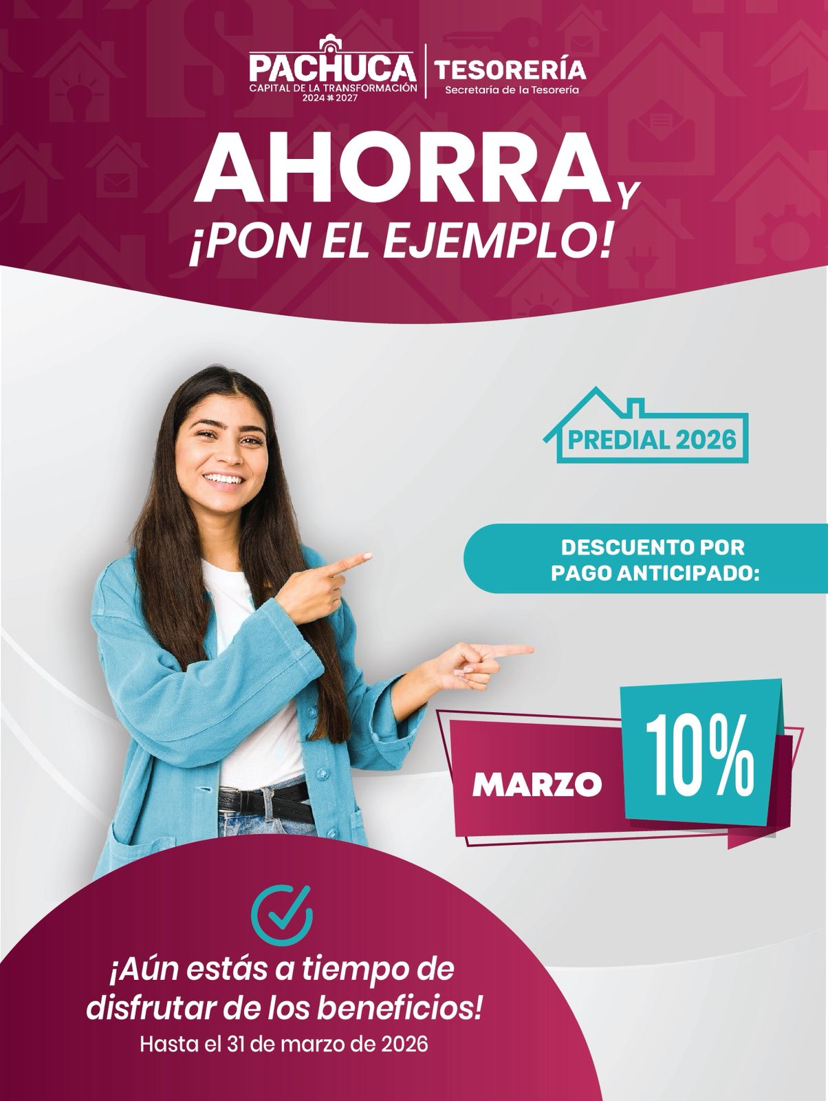 26 De Febrero De 2026, Pachuca, Hidalgo.– El Ayuntamiento de Pachuca informó que durante marzo permanece activa la última fase de descuentos en el pago del impuesto predial 2026, dirigida a las y los propietarios de inmuebles que realicen su contribución dentro del primer trimestre del año.