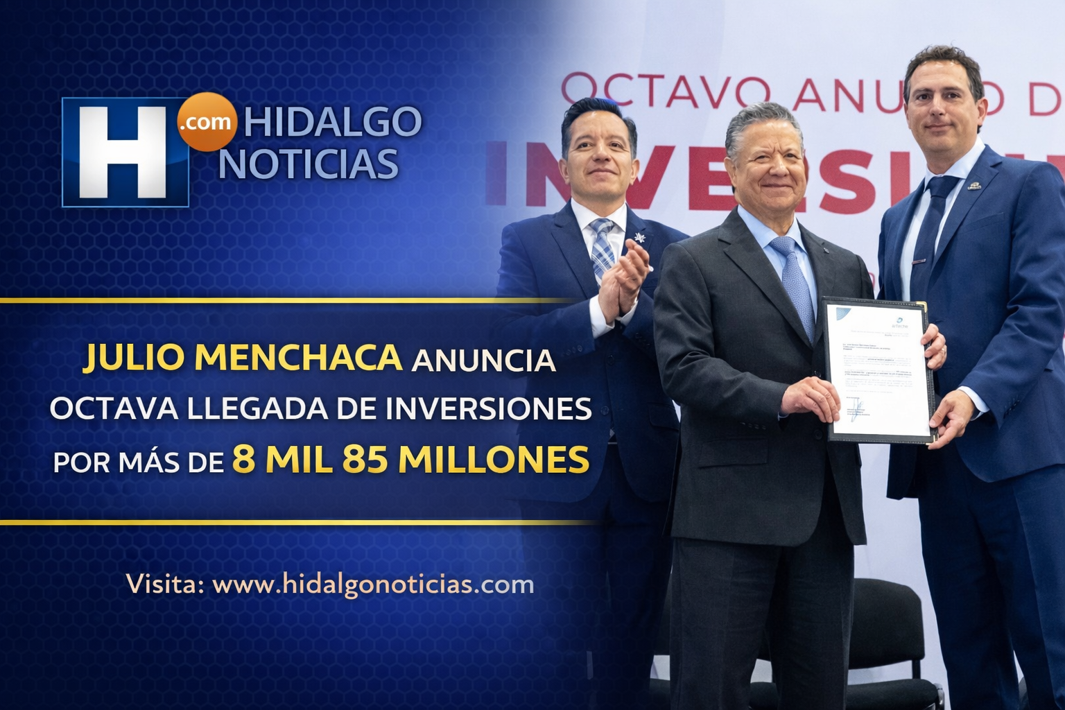 Pachuca, Hidalgo, 16 de febrero de 2026. Con la presentación de 16 nuevos proyectos privados que representan una inversión de 8 mil 85 millones de pesos y la generación estimada de 5 mil 574 empleos directos e indirectos, el gobernador Julio Menchaca Salazar encabezó el octavo anuncio de inversiones de su administración, destacando que la entidad acumula ya 125 mil 800 millones de pesos en capital privado durante 2026.