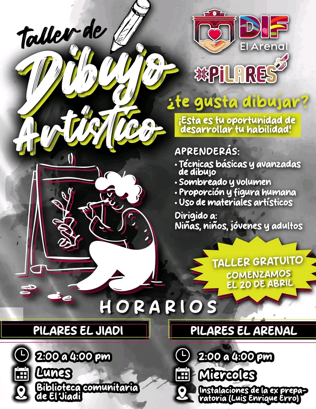 El DIF de El Arenal invita a un taller gratuito de dibujo artístico para todas las edades con sedes en El Jiadi y cabecera municipal.