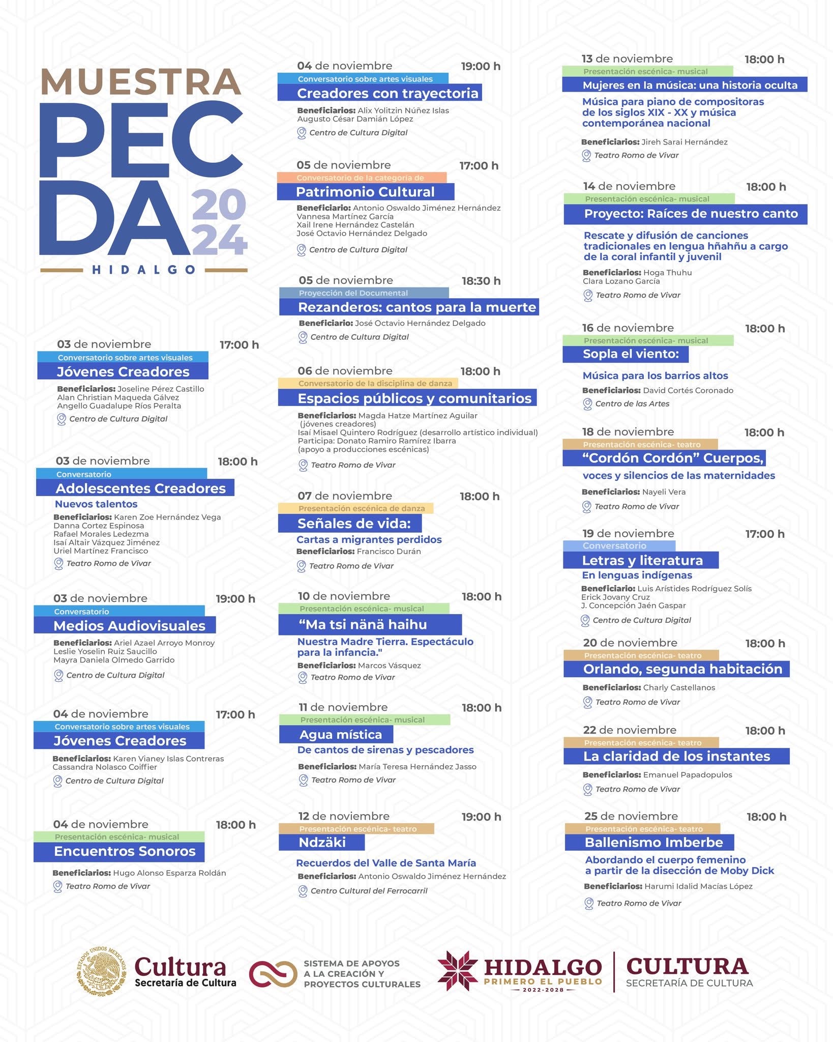 Pachuca de Soto, Hidalgo, 28 de octubre de 2025.– La Secretaría de Cultura del Estado de Hidalgo anunció la realización de la Muestra PECDA Hidalgo 2024, que se llevará a cabo del 3 al 25 de noviembre, con una programación de 21 actividades públicas y gratuitas que acercarán al público a las expresiones artísticas más destacadas del estado.