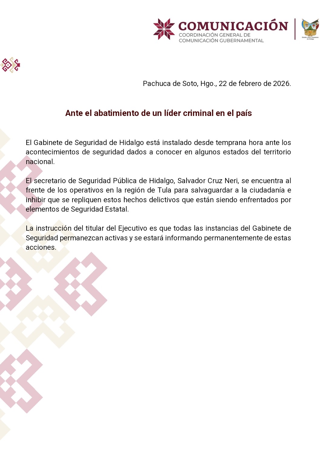 21 de febrero de 2026, Pachuca, Hidalgo. El Gabinete de Seguridad del Gobierno del Estado se instaló desde temprana hora para dar seguimiento y coordinación ante los acontecimientos de seguridad reportados en diversas entidades del país, con el objetivo de reforzar las acciones preventivas en territorio hidalguense.
