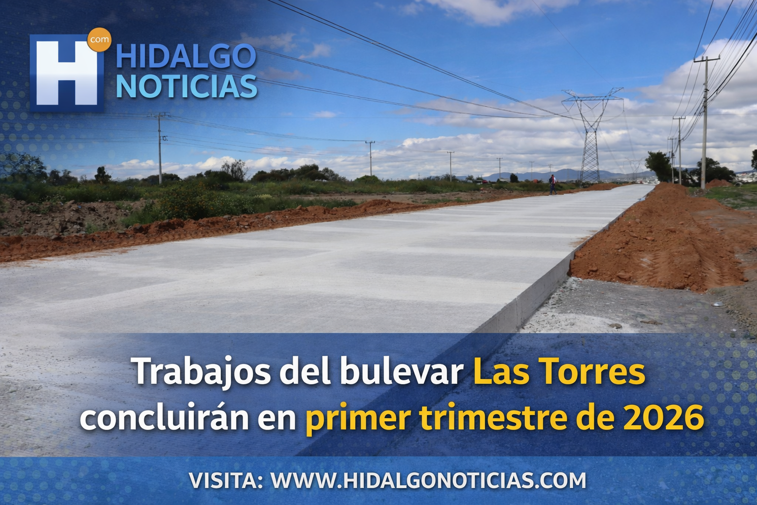 Pachuca, Hidalgo; diciembre de 2025. La pavimentación en un sentido del bulevar Las Torres, considerada una de las obras viales más relevantes en la Zona Metropolitana de Pachuca, registra un avance superior al 80 por ciento y se prevé que concluya durante el primer trimestre de 2026, como parte de los trabajos ejecutados por la Secretaría de Infraestructura Pública y Desarrollo Urbano Sostenible.