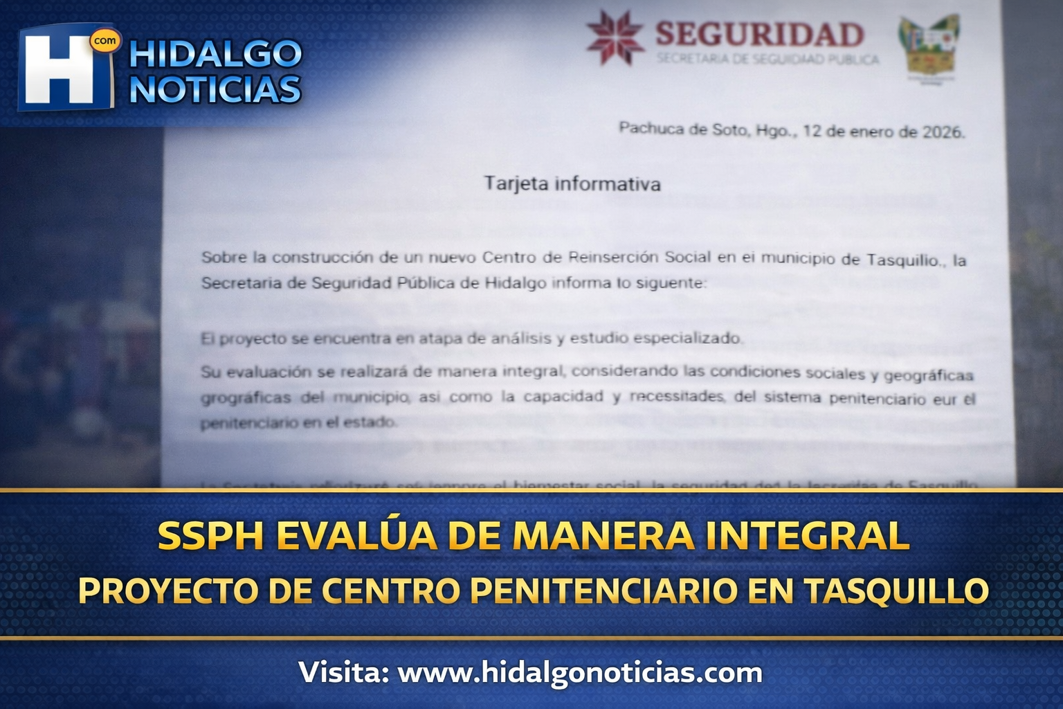 Enero de 2026, Pachuca de Soto, Hidalgo. La Secretaría de Seguridad Pública de Hidalgo informó que el proyecto para la posible construcción de un nuevo Centro de Reinserción Social en el municipio de Tasquillo se encuentra actualmente en una etapa de análisis técnico y evaluación especializada, sin que exista, por el momento, una determinación definitiva.