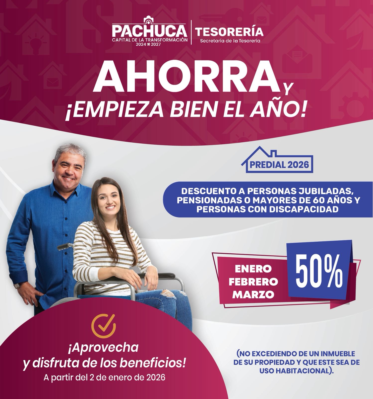 Las autoridades municipales recordaron que las personas jubiladas, pensionadas, mayores de 60 años y personas con discapacidad pueden acceder a un 50 por ciento de descuento durante los meses de enero, febrero y marzo, siempre que sean propietarias de un solo inmueble y que este sea de uso habitacional.
