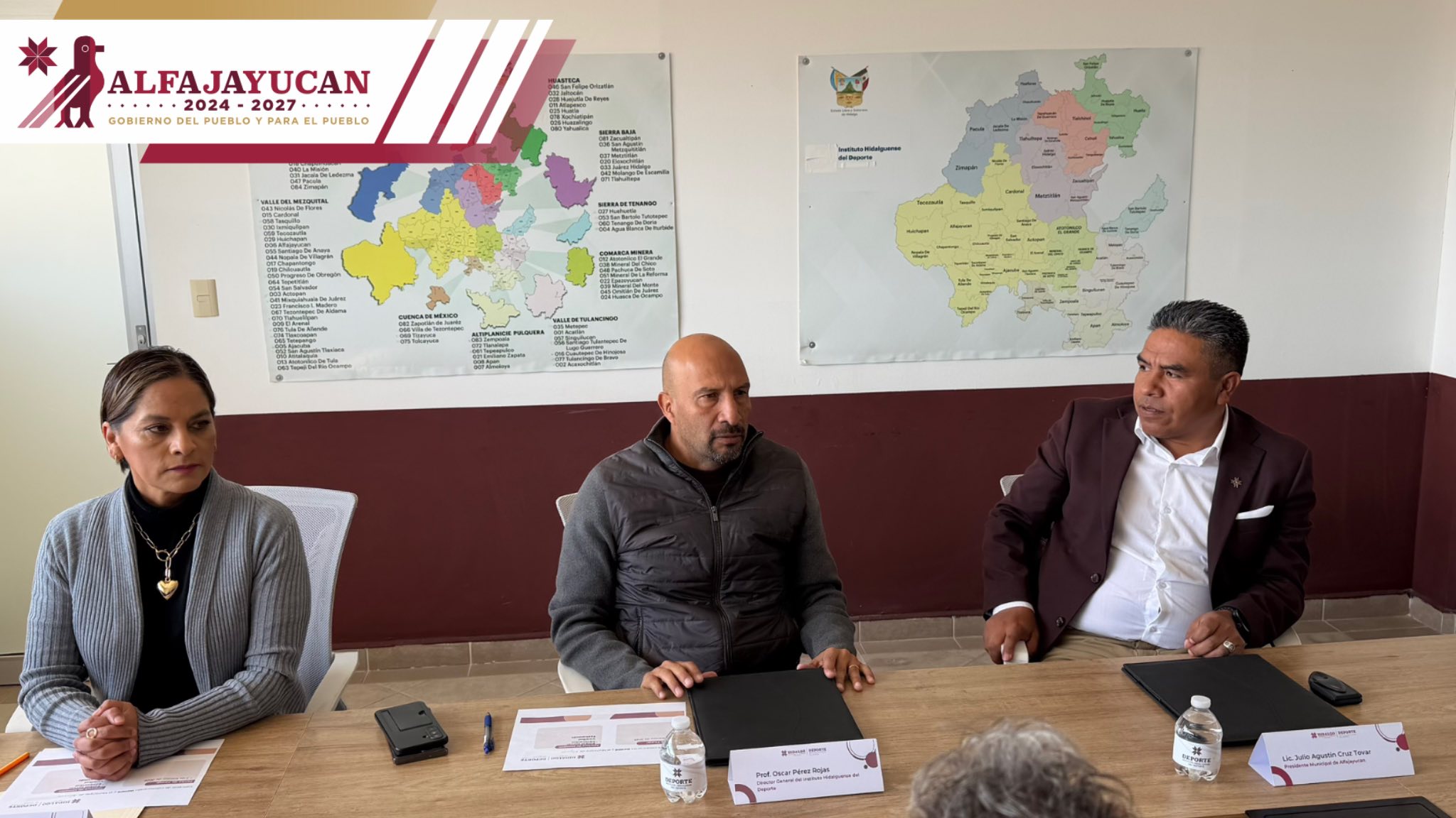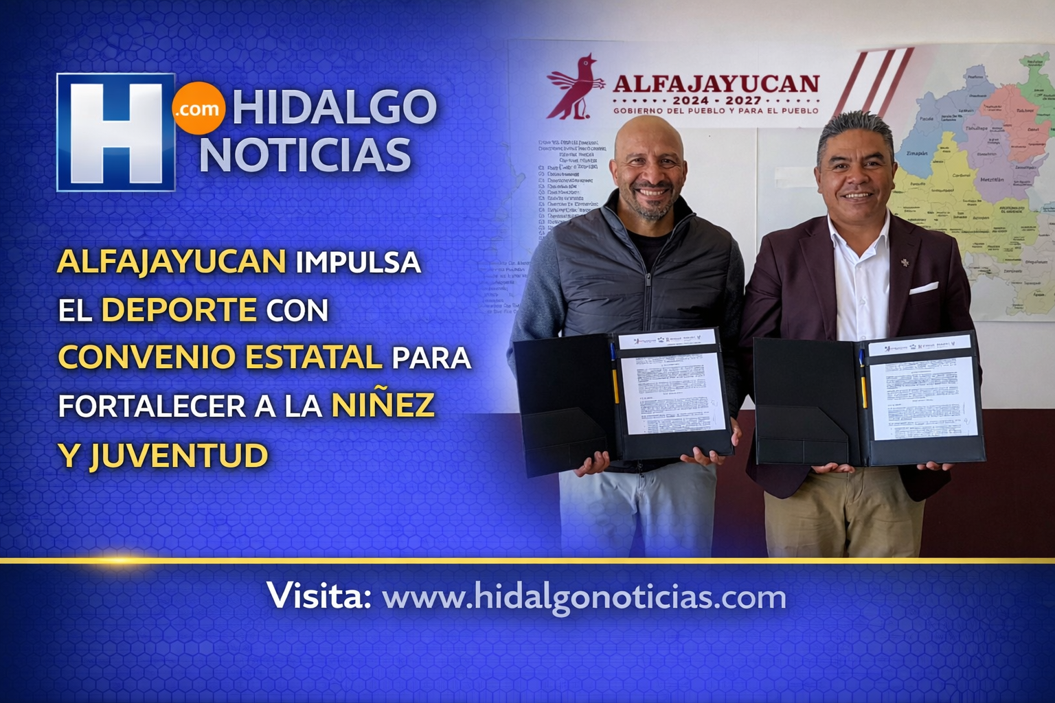 Alfajayucan, Hidalgo.– Con la finalidad de ampliar las oportunidades deportivas y fortalecer el bienestar físico, emocional y social de la niñez y juventud, el gobierno municipal formalizó un convenio de colaboración con el Instituto Hidalguense del Deporte, acuerdo que permitirá reforzar programas y acciones en distintas disciplinas atléticas dentro del municipio.