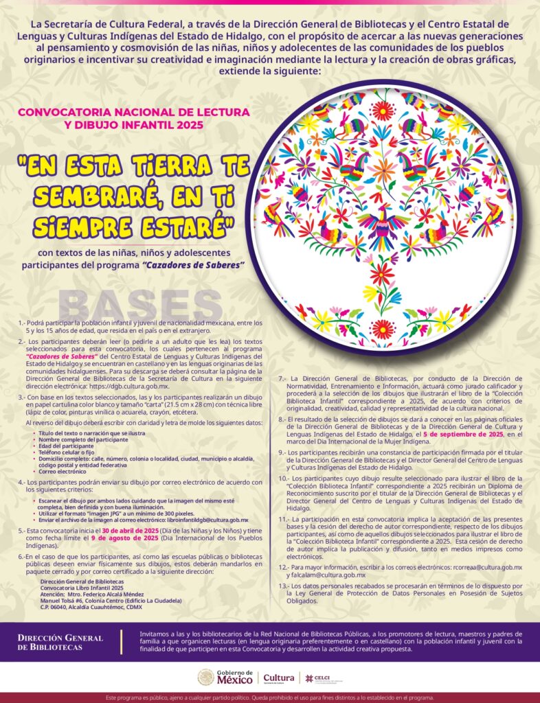 En una iniciativa conjunta para promover el reconocimiento de las lenguas originarias y fortalecer la identidad cultural desde la infancia, la Secretaría de Cultura federal, a través de la Dirección General de Bibliotecas (DGB), en colaboración con la Secretaría de Educación Pública de Hidalgo (SEPH) y el Centro Estatal de Lenguas y Culturas Indígenas (CELCI), lanzó la Convocatoria Nacional de Lectura y Dibujo Infantil 2025 bajo el lema “En esta tierra te sembraré, en ti siempre estaré”.