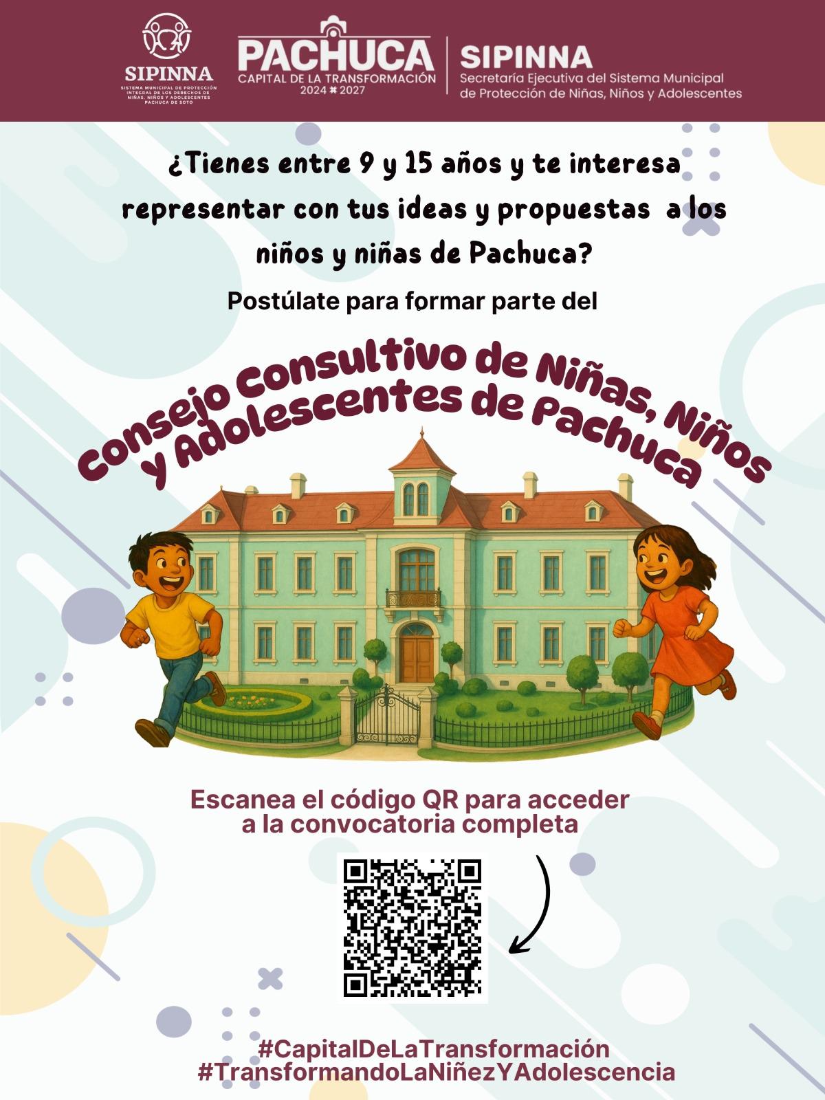 Con el propósito de fomentar la participación activa de la niñez y adolescencia en los asuntos públicos, el Ayuntamiento de Pachuca, a través de la Secretaría Ejecutiva del Sistema de Protección Integral de Niñas, Niños y Adolescentes (SIPINNA), lanzó la convocatoria para conformar su nuevo Consejo Consultivo.