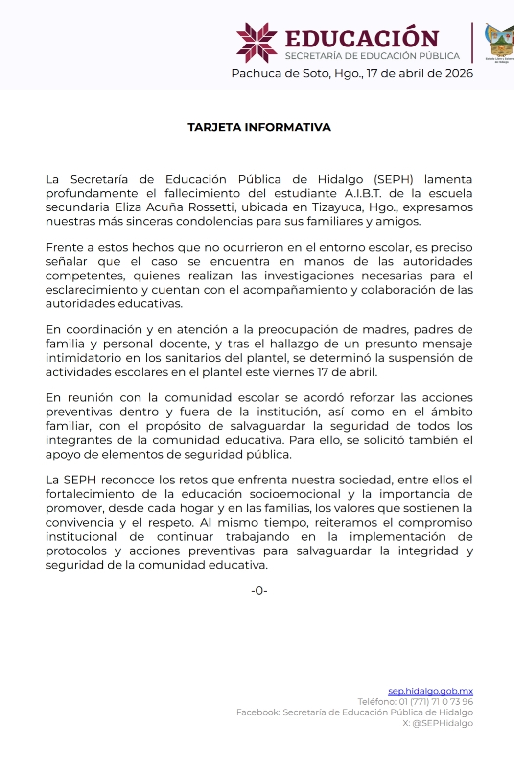 Tizayuca, Hidalgo.— La Secretaría de Educación Pública de Hidalgo informó la suspensión de actividades en la secundaria Eliza Acuña Rossetti luego de una situación que generó preocupación en la comunidad escolar y que actualmente es atendida por las autoridades correspondientes.