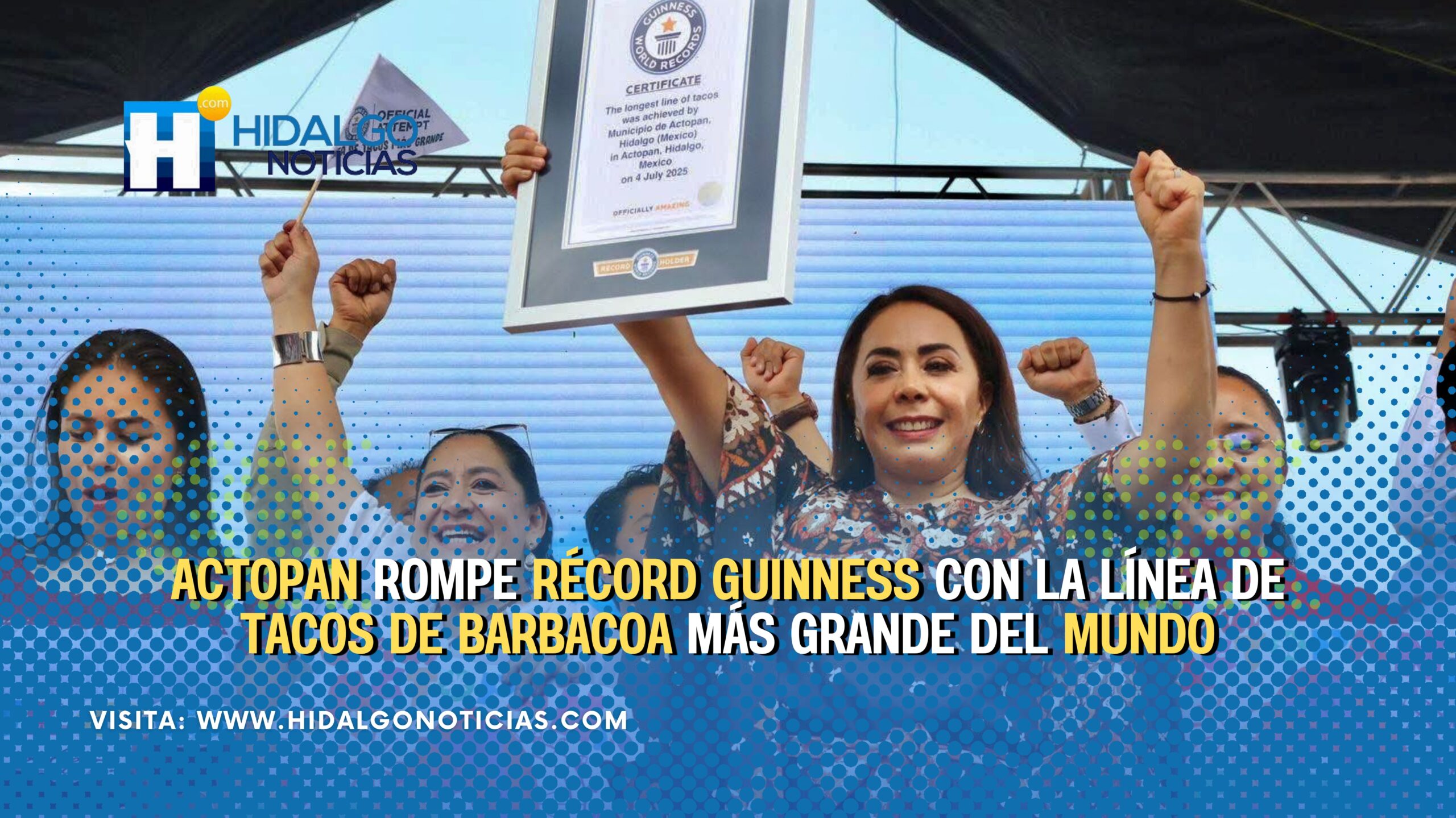 Actopan, Hidalgo, 5 de julio de 2025.— En un hecho sin precedentes para la gastronomía nacional, el municipio de Actopan obtuvo oficialmente el Récord Guinness por haber formado la línea de tacos de barbacoa más extensa del mundo, con un total de 11,400 piezas distribuidas a lo largo de 249.3 metros.