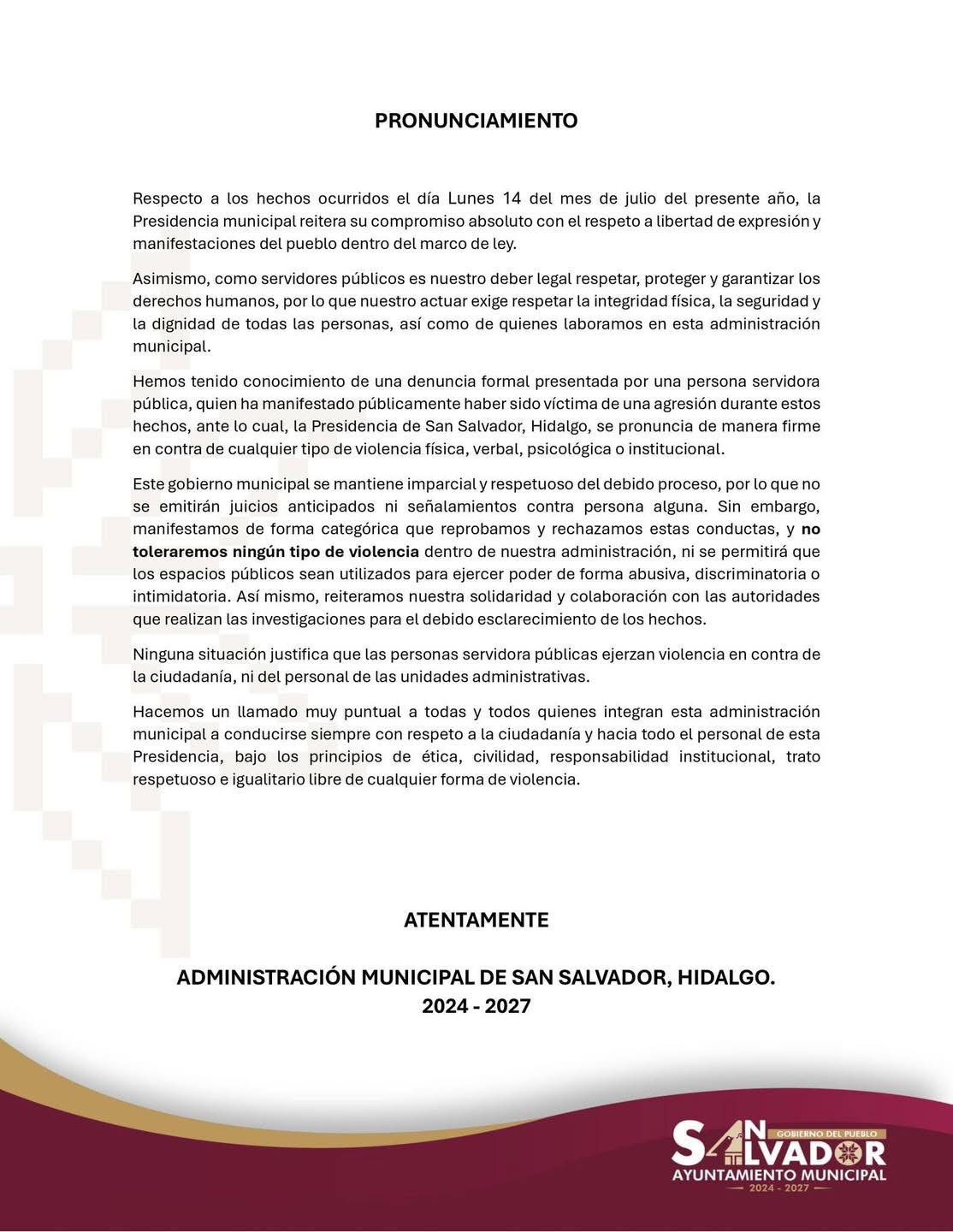 San Salvador, Hgo., 17 de julio de 2025.– Luego de los hechos ocurridos el pasado lunes 14 de julio en el Ayuntamiento de San Salvador, las autoridades municipales expresaron su postura institucional y reiteraron su compromiso con el respeto irrestricto a la legalidad, los derechos humanos y la libertad de expresión.