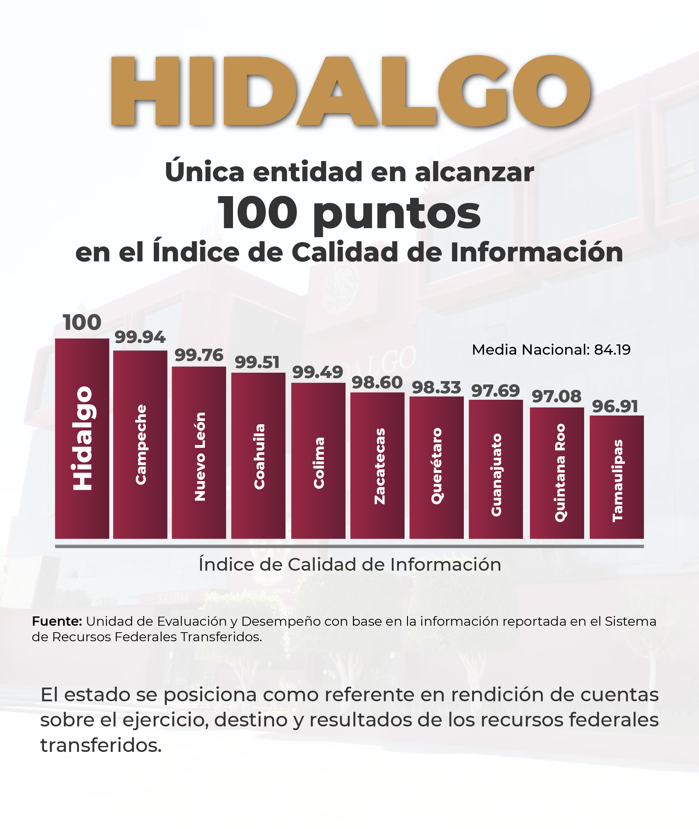 Pachuca, Hidalgo, 19 de julio de 2025.– Durante el primer trimestre de este año, el estado de Hidalgo alcanzó la máxima puntuación en el Índice de Calidad en la Información (ICI), al obtener 100 puntos, posicionándose como la entidad con mejor desempeño a nivel nacional en materia de transparencia y rendición de cuentas en el uso de recursos públicos.