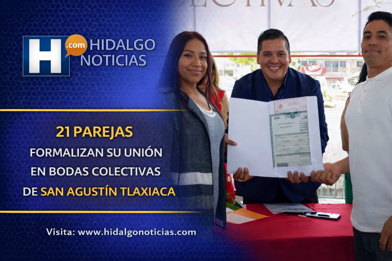 San Agustín Tlaxiaca, Hidalgo, 16 de febrero de 2026. Un total de 21 parejas contrajeron matrimonio civil durante la ceremonia de Bodas Colectivas organizada por el Ayuntamiento, evento que otorgó certeza jurídica a las familias participantes y marcó el inicio formal de una nueva etapa en sus vidas.