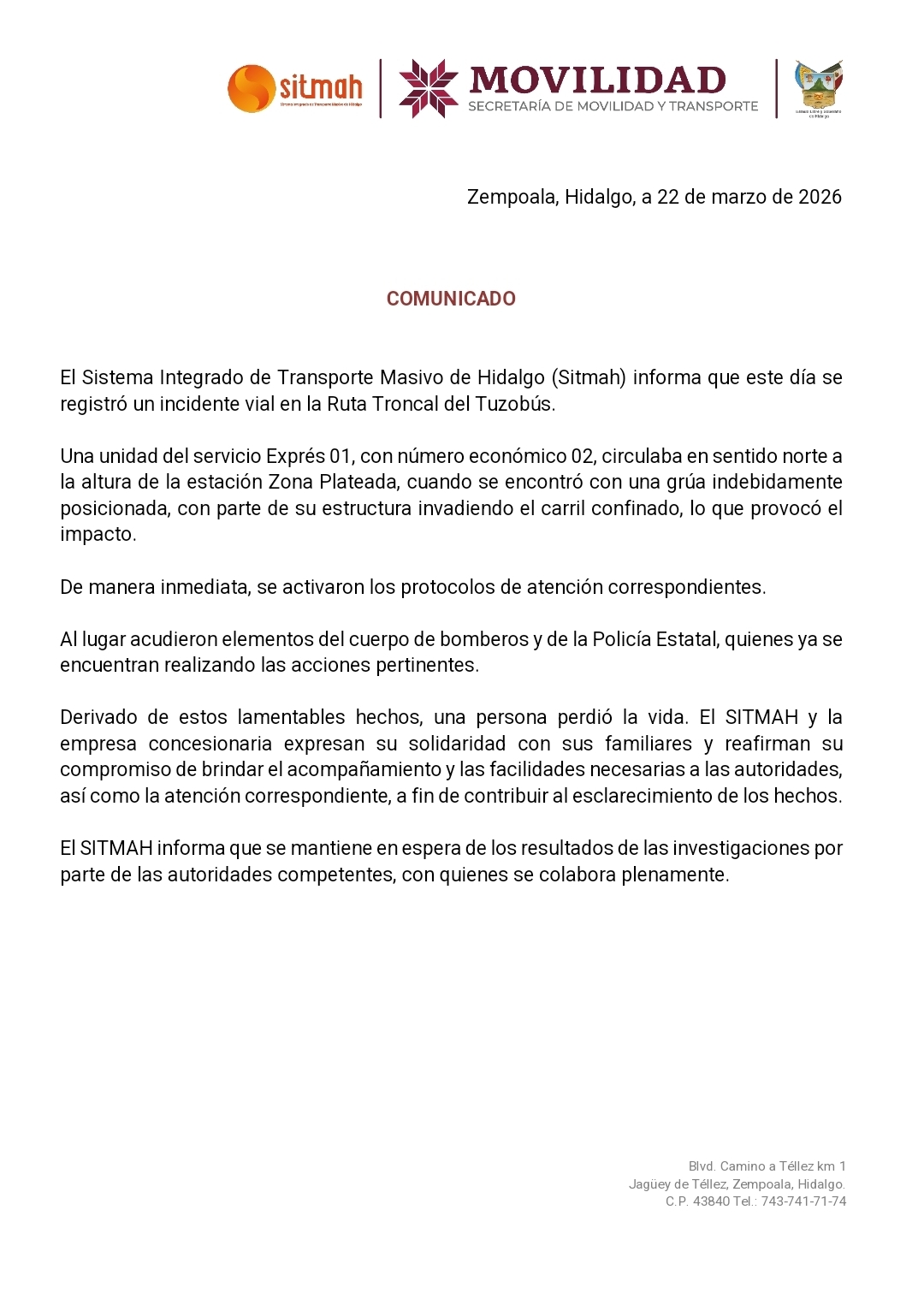 Pachuca, Hidalgo, 19 de marzo de 2026.— El Sistema Integrado de Transporte Masivo de Hidalgo (SITMAH) informó que se registró un incidente vial en la Ruta Troncal del Tuzobús, a la altura de la estación Zona Plateada, el cual dejó como saldo el fallecimiento de una persona.