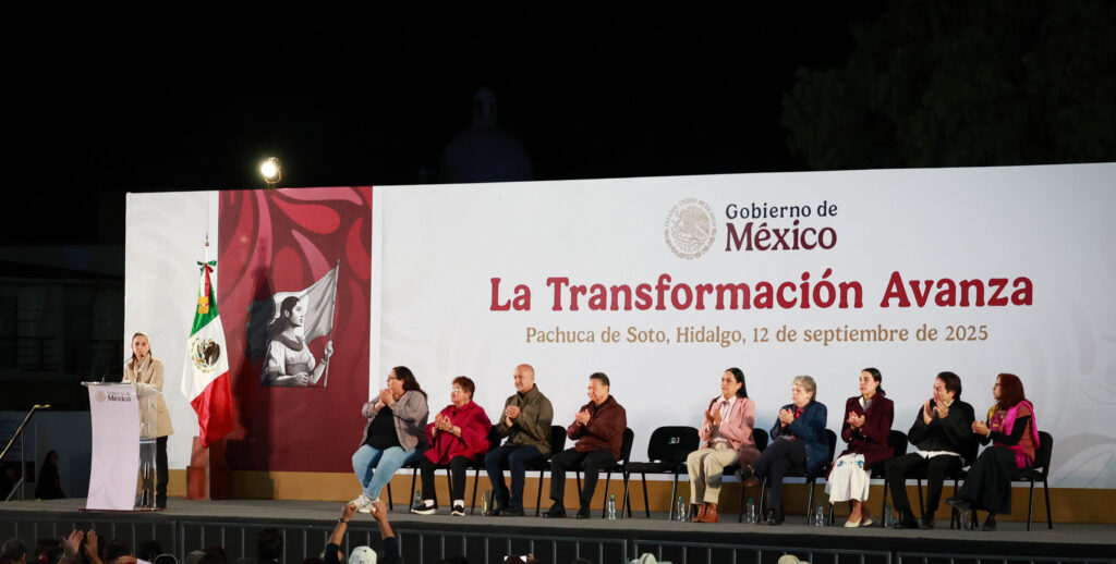 Pachuca, Hgo., 12 de septiembre de 2025.– En un acto que reunió a miles de asistentes, la presidenta de México, Claudia Sheinbaum Pardo, presentó en Hidalgo un informe de resultados acompañado por el gobernador Julio Menchaca Salazar, quien destacó la relevancia de las obras federales que actualmente se realizan en la entidad.