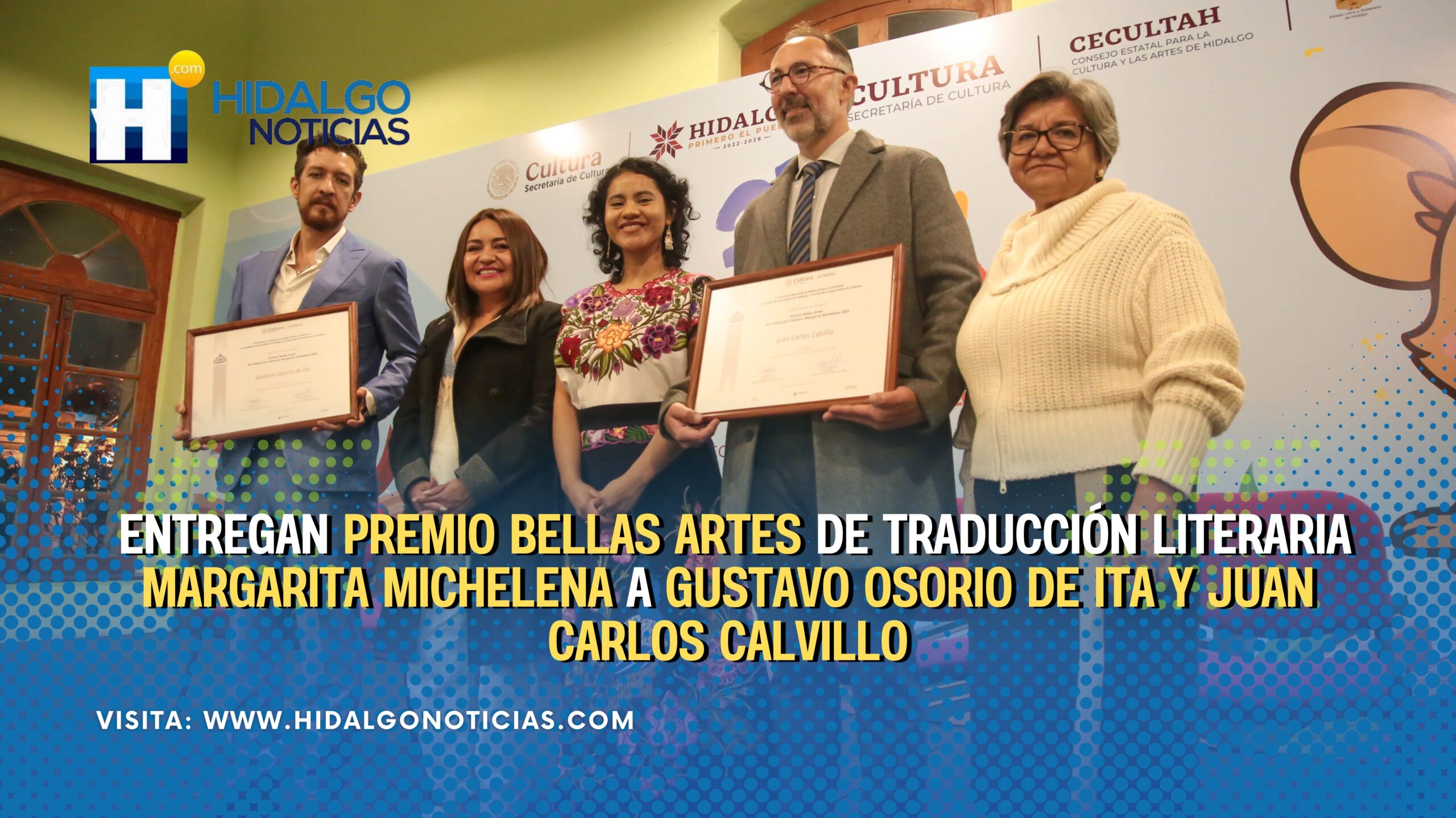 Pachuca, Hidalgo, 29 de septiembre de 2025.– En la capital hidalguense se llevó a cabo la entrega del Premio Bellas Artes de Traducción Literaria Margarita Michelena 2025, distinción otorgada por la Secretaría de Cultura del Gobierno de México y el Instituto Nacional de Bellas Artes y Literatura (INBAL), en coordinación con el Gobierno de Hidalgo. Los reconocidos en esta edición fueron Gustavo Osorio de Ita, en la categoría de poesía, y Juan Carlos Calvillo, en el rubro de cuento.
