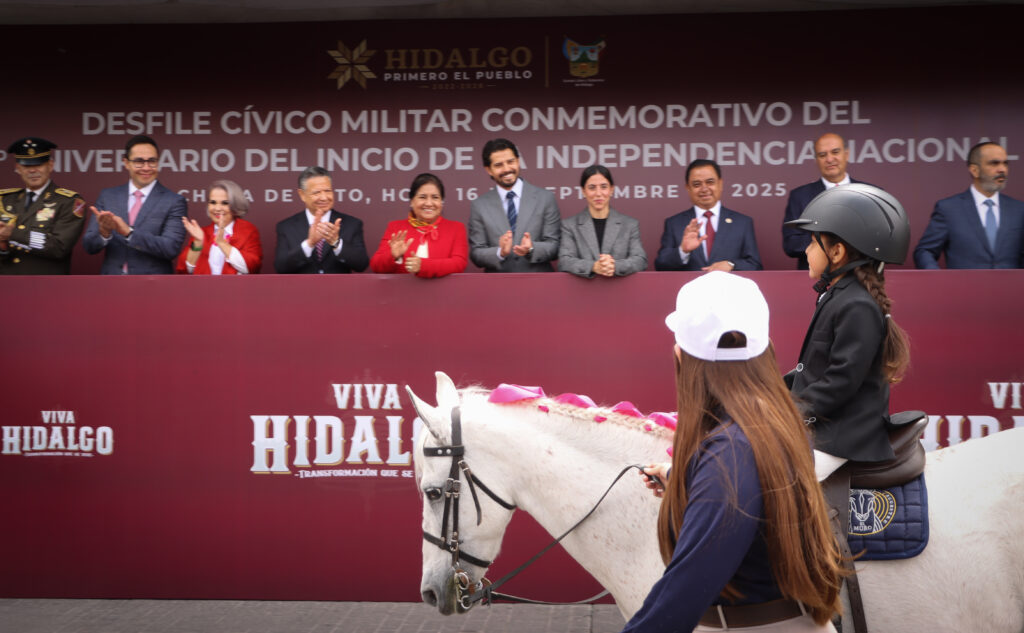 Pachuca, Hgo., 16 de septiembre de 2025.– En el marco de la conmemoración del 215 Aniversario del Inicio de la Independencia de México, el gobernador Julio Menchaca Salazar encabezó una guardia de honor en el monumento a Miguel Hidalgo, ubicado en la Plaza Constitución, para posteriormente presenciar el tradicional Desfile Cívico-Militar en el centro de la capital hidalguense.