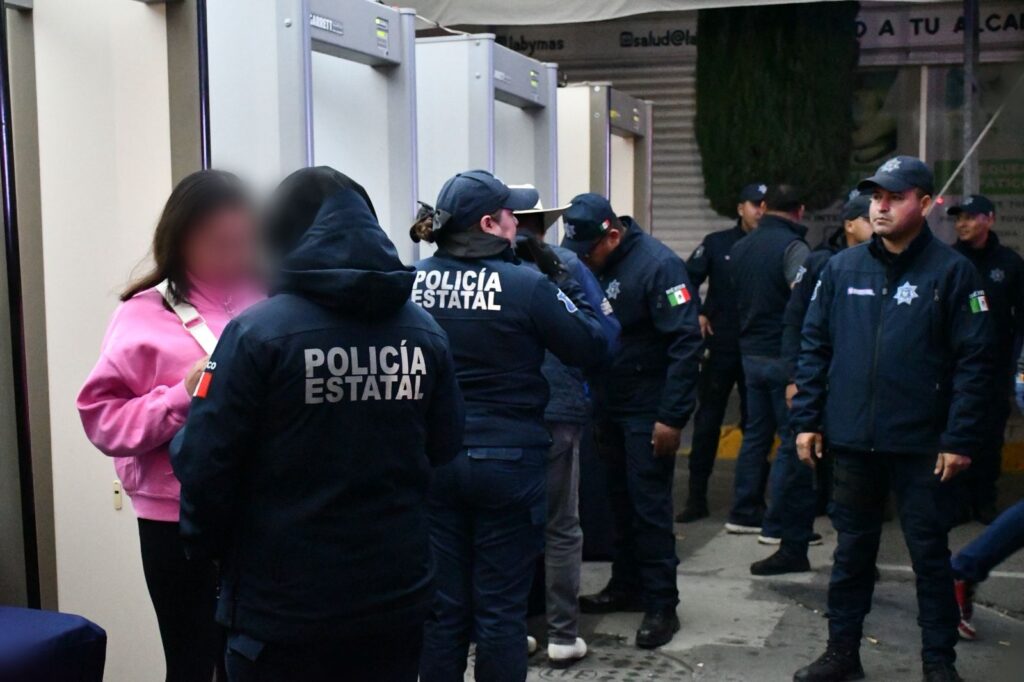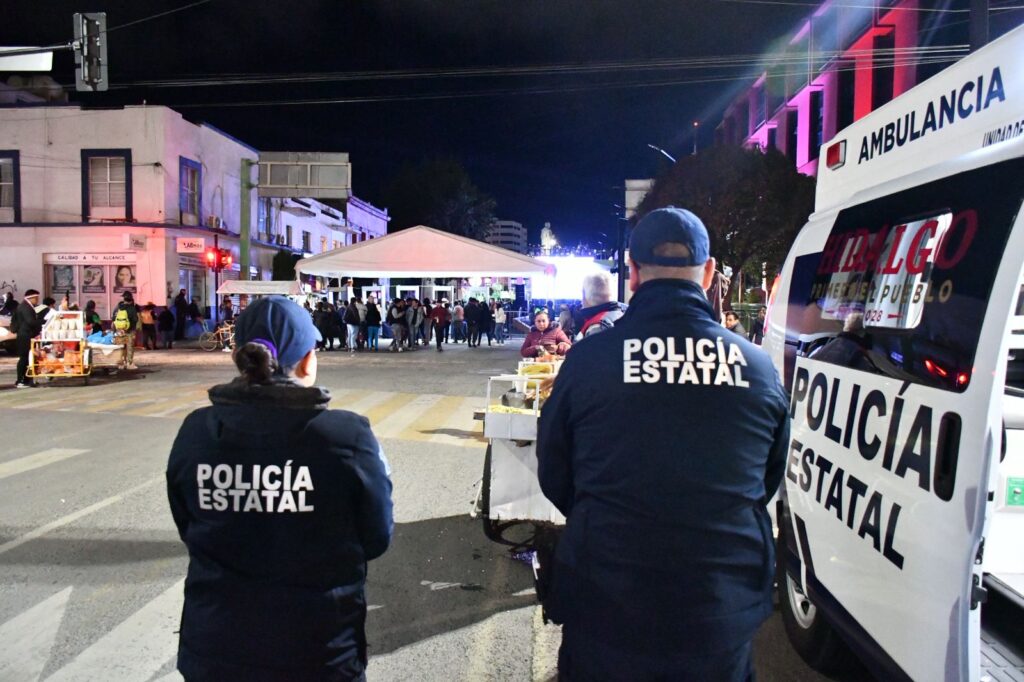 Con el propósito de resguardar a las más de 35 mil personas reunidas en la Plaza Juárez de Pachuca, se implementaron recorridos de vigilancia con la participación de la Unidad Táctica, la Unidad K9, la Policía Violeta, policías estatales y el Heroico Cuerpo de Bomberos.