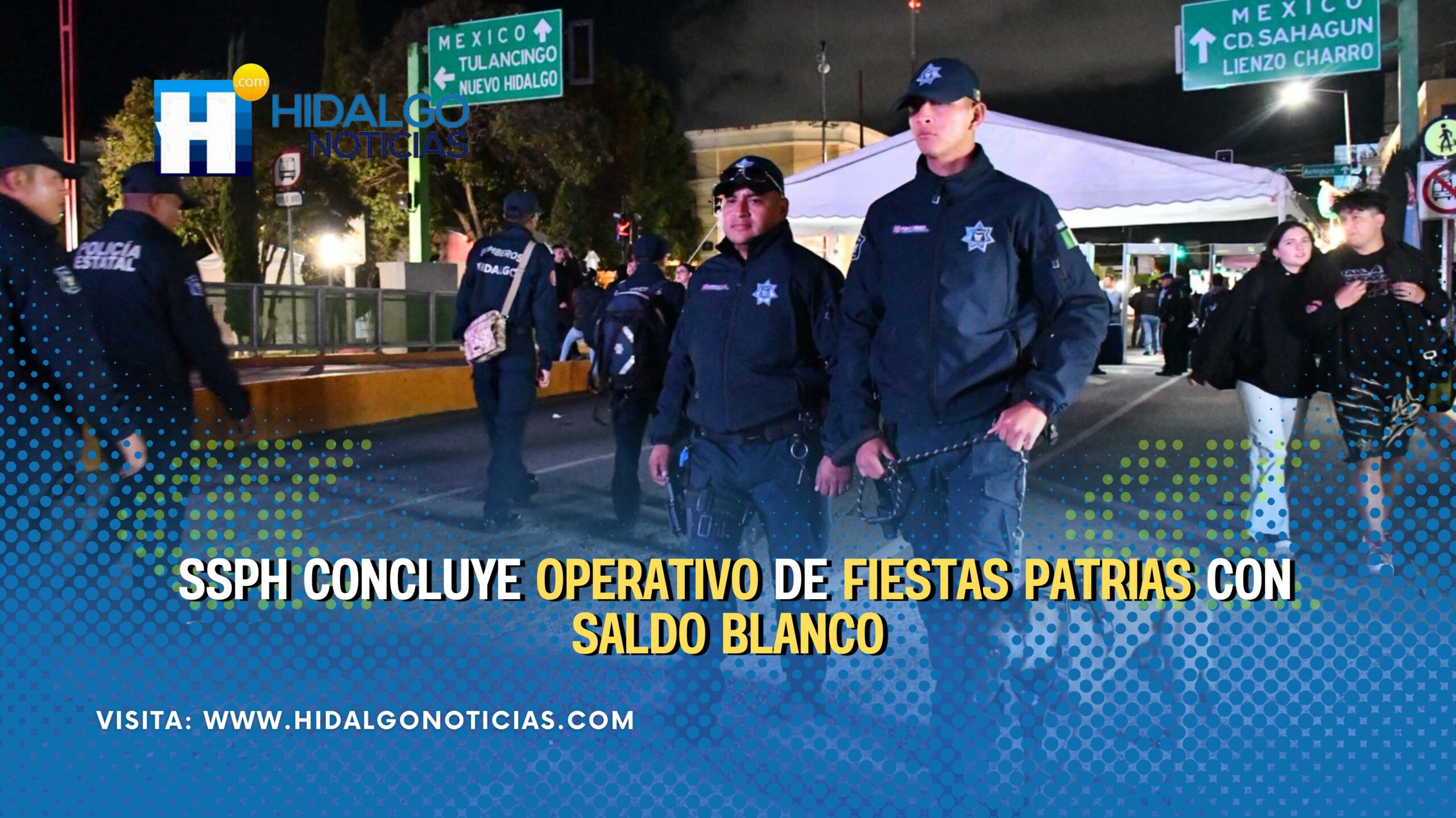 Pachuca, Hgo., 16 de septiembre de 2025.– La Secretaría de Seguridad Pública de Hidalgo (SSPH) informó que el operativo especial desplegado con motivo de la celebración del 215 Aniversario del Grito de Independencia concluyó con saldo blanco en los 84 municipios de la entidad, incluidas las actividades realizadas en la capital del estado.