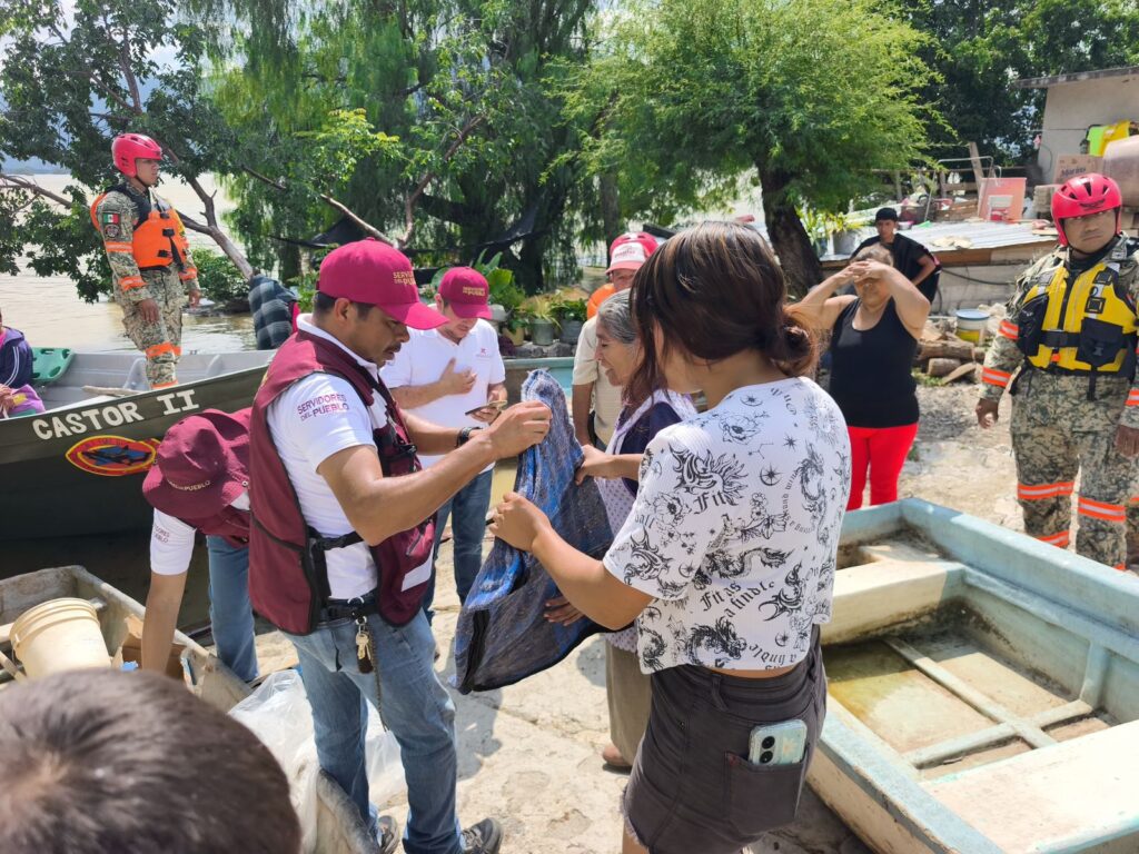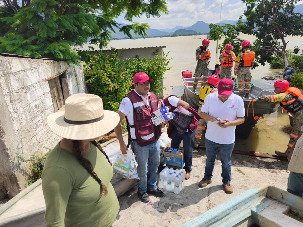 Debido a que los caminos terrestres permanecen intransitables, integrantes de los Servidores del Pueblo de la Secretaría de Bienestar e Inclusión Social (Sebiso) emplearon lanchas para hacer llegar los apoyos directamente a las familias que se encuentran incomunicadas, asegurando que la ayuda no se detuviera pese a las condiciones adversas.