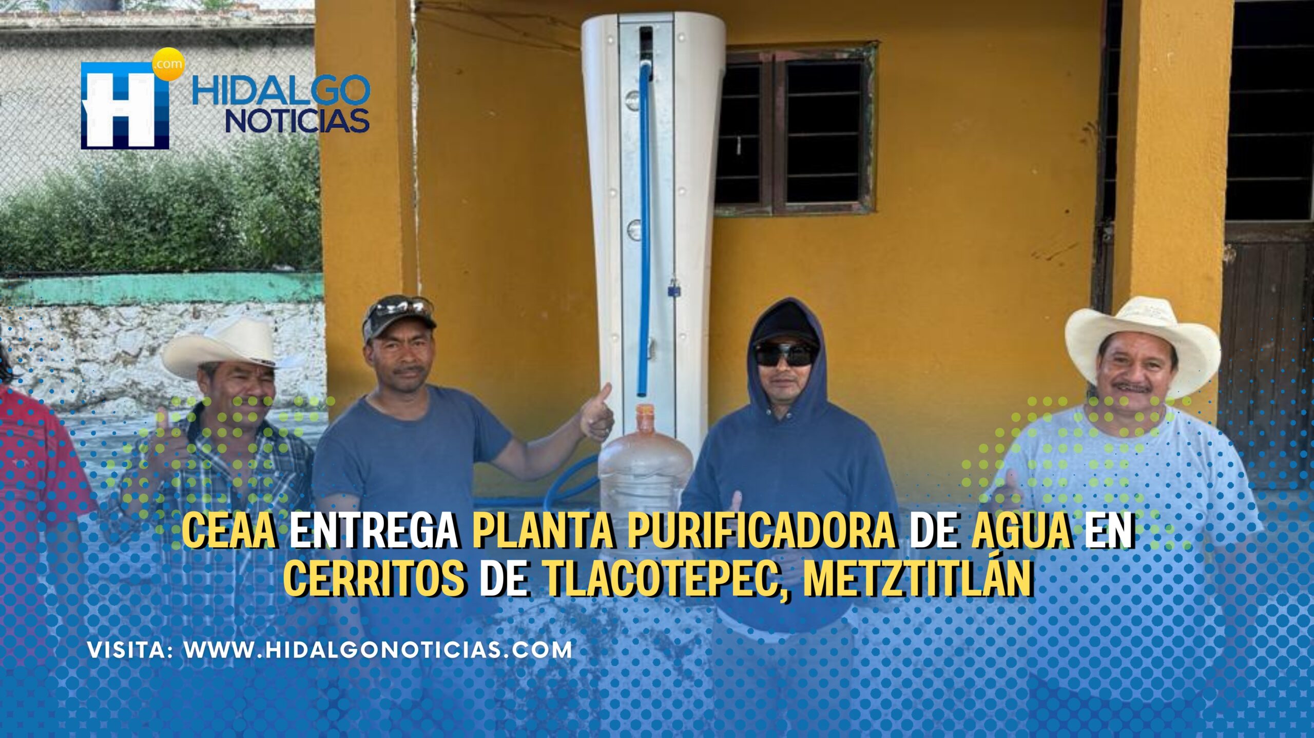 Metztitlán, Hidalgo, 14 de octubre de 2025.– En atención a las afectaciones ocasionadas por la reciente vaguada monzónica, el Gobierno de Hidalgo, a través de la Comisión Estatal del Agua y Alcantarillado (CEAA), entregó una planta purificadora de agua en la comunidad Cerritos de Tlacotepec, municipio de Metztitlán, como parte de las acciones inmediatas para garantizar el acceso al agua segura en zonas impactadas por el fenómeno.
