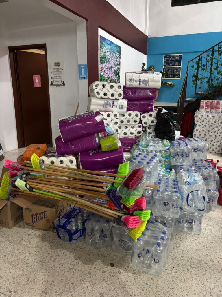 Los apoyos incluyeron alimentos y artículos esenciales como sardinas, frijol, arroz, frutas en almíbar, espagueti, jabón, shampoo, toallas sanitarias y pañales; además de productos de limpieza como cloro, líquidos desinfectantes, jabón en polvo, escobas y utensilios de aseo. También se entregaron herramientas de trabajo —palas y zapapicos—, así como papel higiénico, alimento para mascotas y medicamentos diversos, entre ellos analgésicos y tratamientos infantiles.