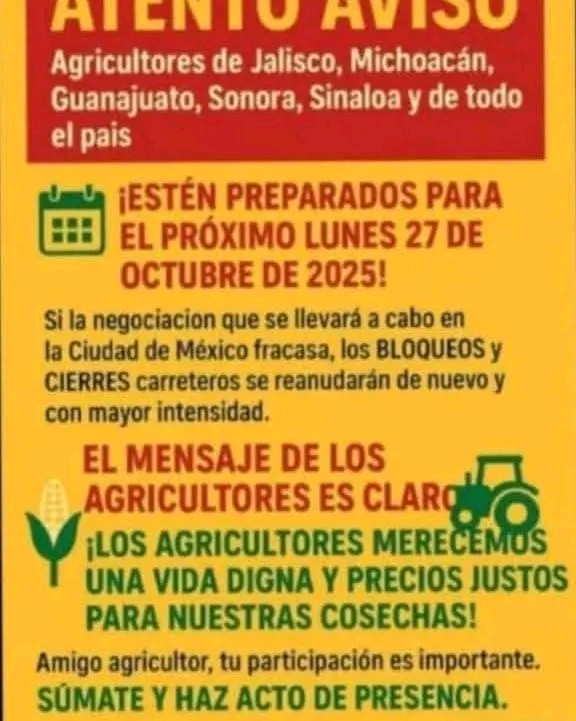Ciudad de México, 27 de octubre de 2025.– Productores de maíz provenientes de 14 estados del país, entre ellos agricultores de la región Tula–Tepeji en Hidalgo, anunciaron que este lunes saldrán desde las 3:00 de la madrugada rumbo al Zócalo capitalino y a la caseta de Tepotzotlán para exigir un precio justo del maíz.