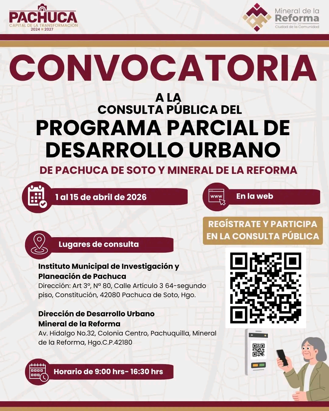 Para consulta, registro y participación ciudadana, se encuentra disponible el siguiente enlace: https://imip.pachuca.gob.mx/consulta-ppdu/