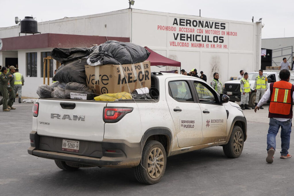 Entre los insumos entregados destacan 573 despensas armadas, 468 botellas de agua de 500 mililitros, 282 de 1.5 litros, 42 garrafas de cinco litros, 760 prendas de ropa, 78 pares de zapatos y más de 200 piezas de medicamentos en diversas presentaciones.