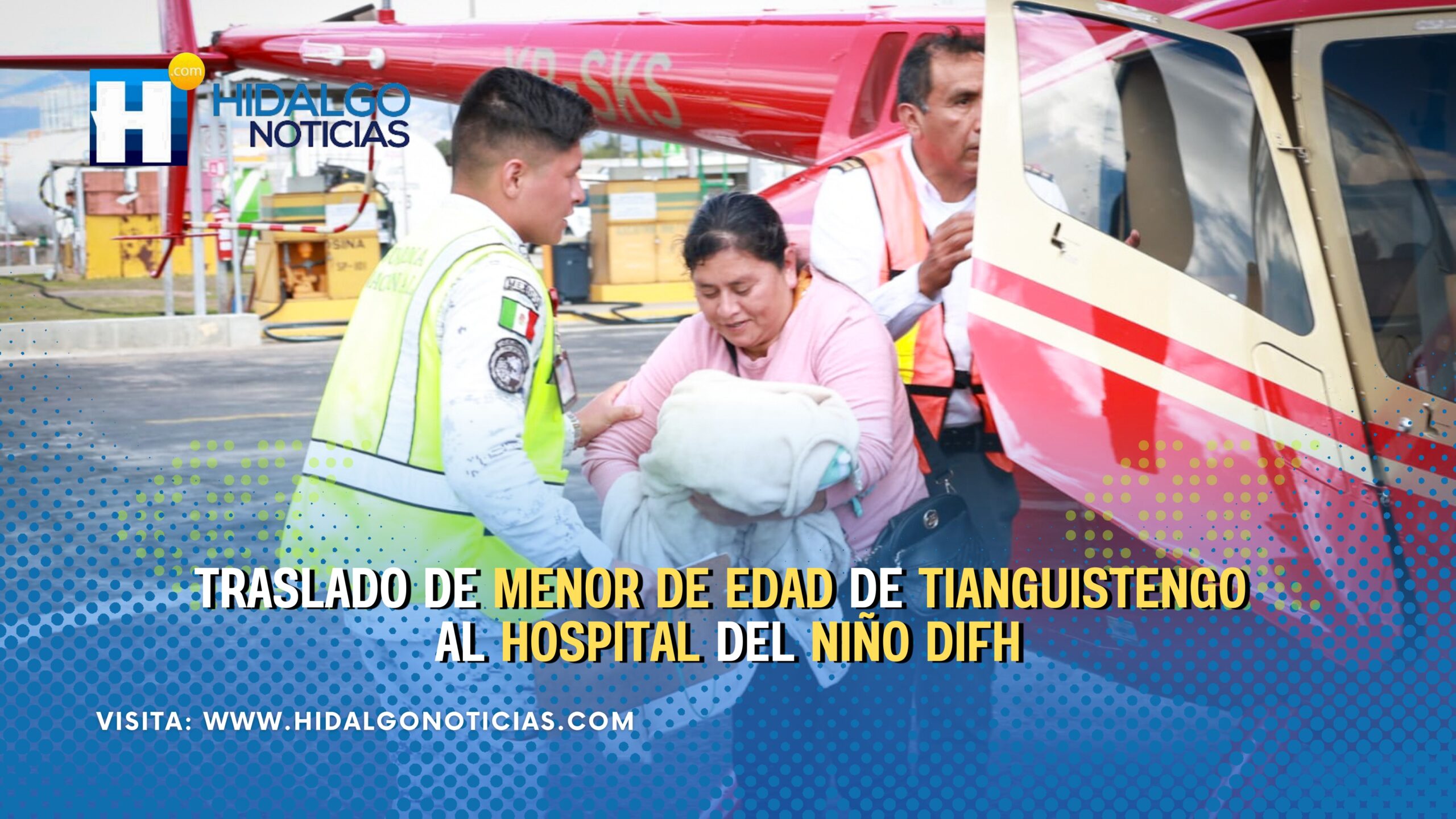 Pachuca, Hidalgo, 14 de octubre de 2025.– En una acción coordinada entre el Gobierno del Estado y el Sistema para el Desarrollo Integral de la Familia de Hidalgo (DIFH), se llevó a cabo el traslado aéreo de un menor de 11 meses de edad desde la comunidad de Coamelco, en el municipio de Tianguistengo, hasta la capital hidalguense, donde ya recibe atención médica especializada.
