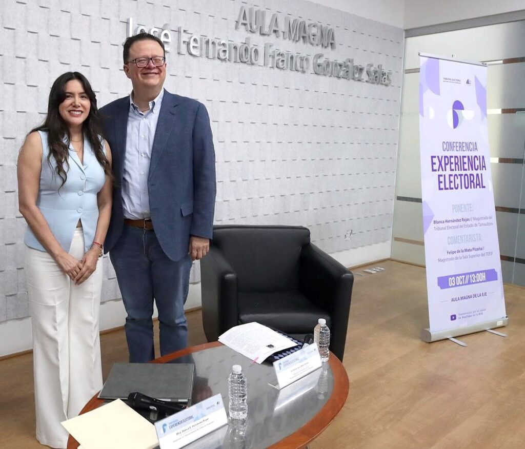 Ciudad de México, 3 de octubre de 2025. En la Escuela Judicial Electoral (EJE) del Tribunal Electoral del Poder Judicial de la Federación (TEPJF) se llevó a cabo la conferencia Experiencia Electoral, impartida por la magistrada del Tribunal Electoral de Tamaulipas, Blanca Hernández Rojas, con la mediación del magistrado de la Sala Superior del TEPJF, Felipe de la Mata Pizaña.