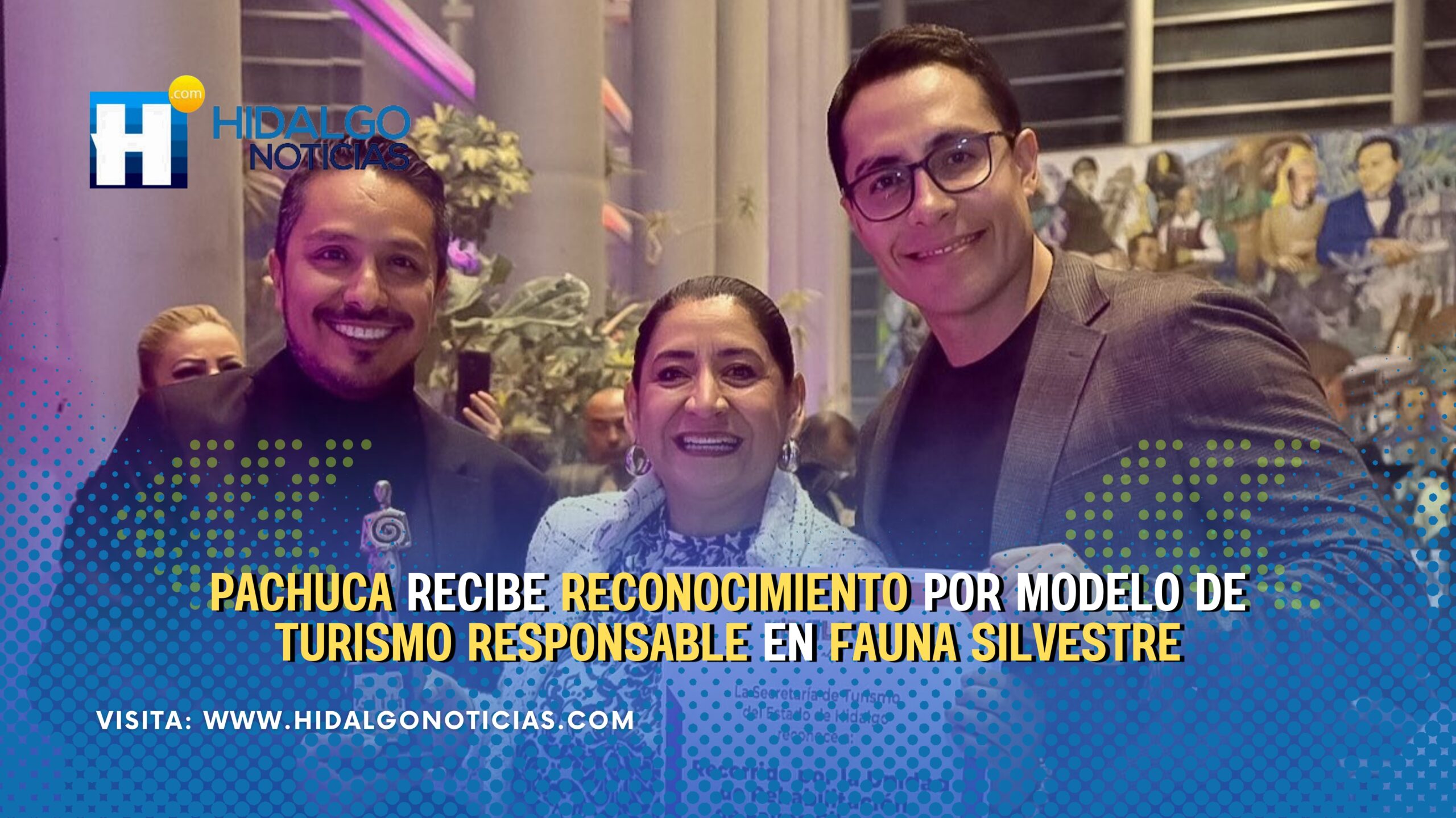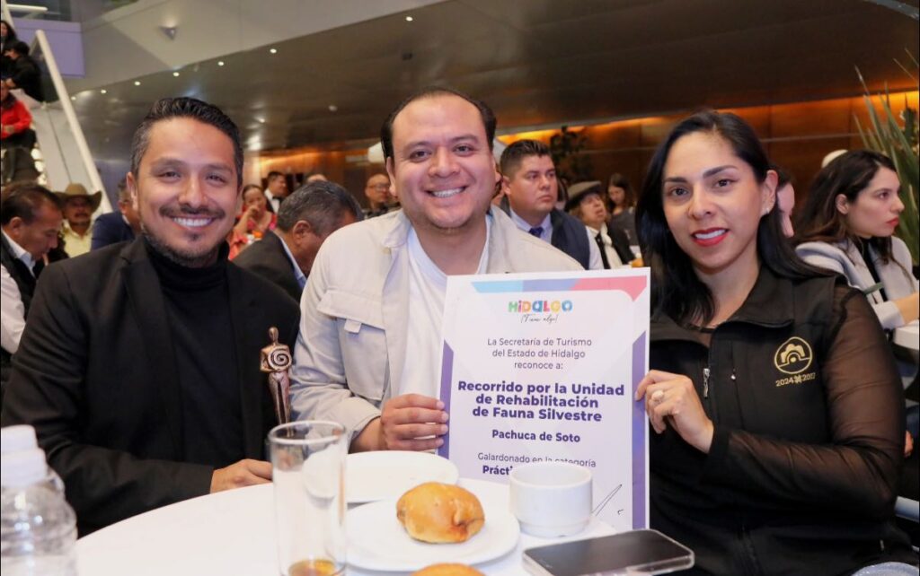 Pachuca de Soto, Hidalgo, 21 de noviembre de 2025.- El presidente municipal de Pachuca, Jorge Reyes, y el biólogo Daniel Monroy recibieron el reconocimiento “Práctica Ecofriendly” durante los Galardones a la Innovación Turística que otorga la Secretaría de Turismo del Estado de Hidalgo, distinción que reconoce el trabajo realizado a través de los recorridos en la Unidad de Rehabilitación de Fauna Silvestre como una experiencia turística responsable, educativa y sostenida en el cuidado de las especies.