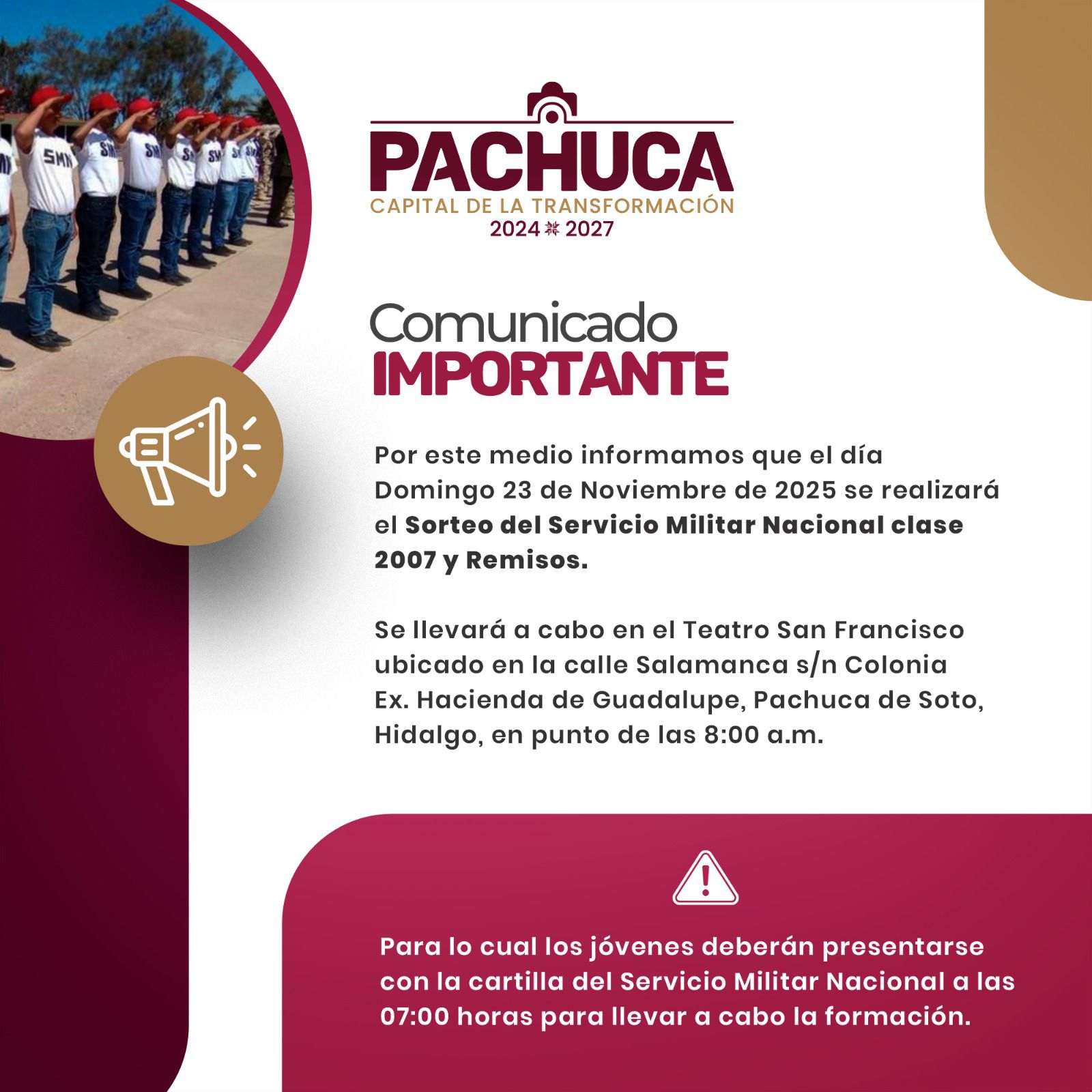 Pachuca de Soto, Hidalgo, 23 de noviembre de 2025.- El Ayuntamiento de Pachuca anunció que el próximo domingo se llevará a cabo el sorteo del Servicio Militar Nacional dirigido a las y los jóvenes de la clase 2007, así como a remisos que realizaron su trámite en tiempo y forma, a fin de cumplir con esta obligación cívica en los términos que establece la normatividad vigente.