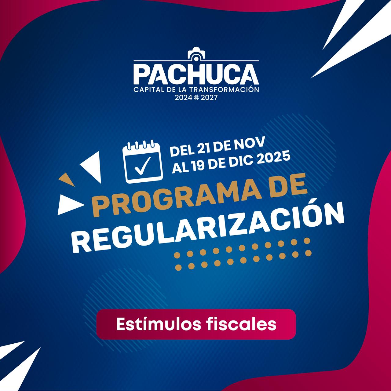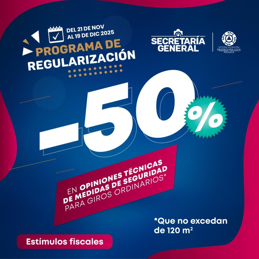Pachuca de Soto, Hidalgo, 20 de noviembre de 2025.- Con la intención de reducir rezagos en trámites y facilitar el cumplimiento de obligaciones fiscales y administrativas, el Ayuntamiento de Pachuca puso en marcha el Programa de Regularización 2025, esquema que contempla diversos estímulos y descuentos aplicables del 21 de noviembre al 19 de diciembre en distintas áreas de la administración municipal.