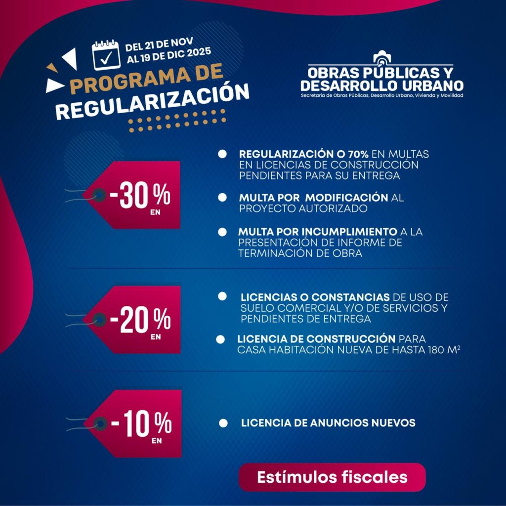 En el ámbito de Obras Públicas, se ofrecerán estímulos para la regularización de licencias y permisos vinculados al desarrollo urbano. Entre ellos, reducción en el costo de licencias o constancias de uso de suelo comercial y de servicios; descuentos significativos en la regularización y multas asociadas a licencias de construcción no concluidas o no entregadas; apoyos para licencias de construcción por modificación de proyectos autorizados; así como beneficios para viviendas nuevas de hasta 180 metros cuadrados. De igual forma, se contemplan facilidades en actualizaciones, recargos y licencias de anuncios para el ejercicio 2025, tanto en renovaciones como en regularizaciones.
