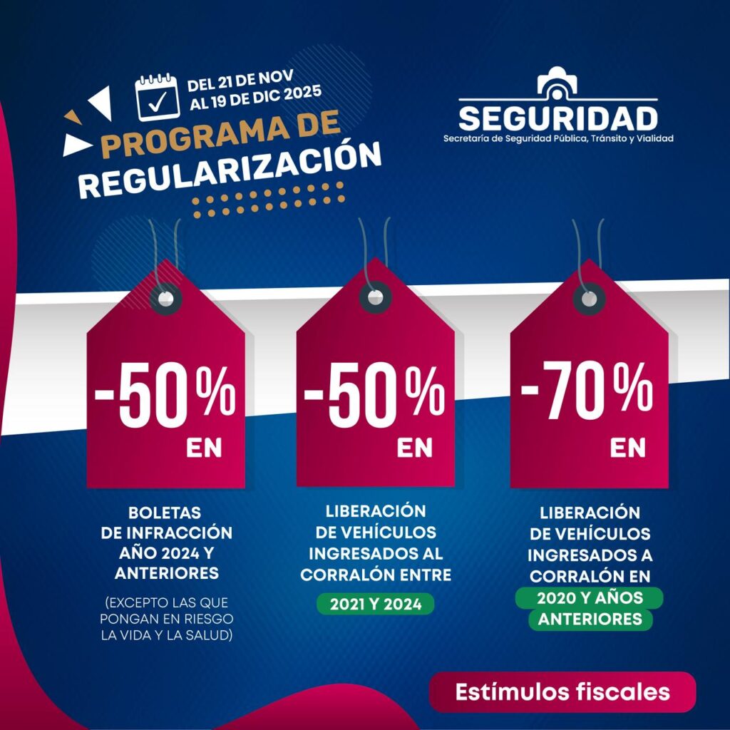 En materia de Seguridad Pública, Tránsito y Vialidad, se otorgarán descuentos del 50 por ciento en boletas de infracción generadas en 2024 y años previos, con excepción de aquellas relacionadas con conductas que pongan en riesgo la vida y la salud. Asimismo, se establecen reducciones del 50 por ciento en la liberación de vehículos ingresados al corralón entre 2021 y 2024, así como del 70 por ciento para unidades que se encuentran en esa condición desde 2020 o ejercicios anteriores.