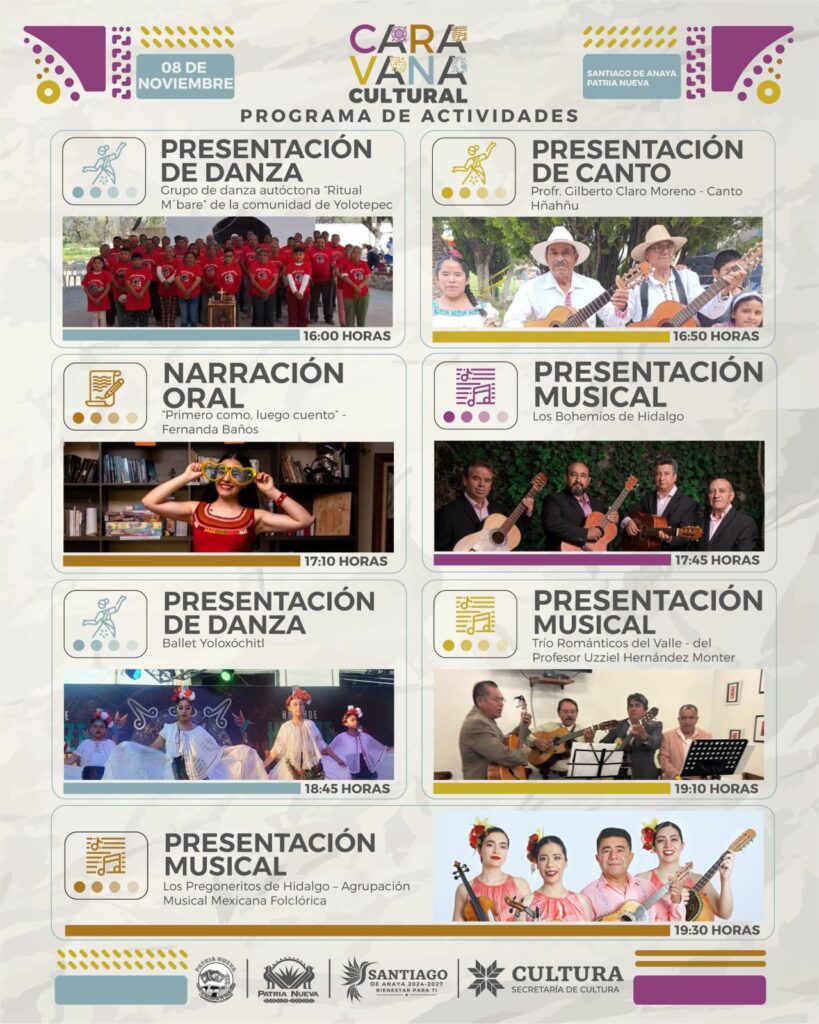 La Caravana Cultural es resultado de la colaboración entre la Secretaría de Cultura del Estado de Hidalgo y el Ayuntamiento de Santiago de Anaya, con el propósito de fortalecer la vida artística local, fomentar el acceso a la cultura y reconocer la diversidad creativa que distingue a cada región del estado.